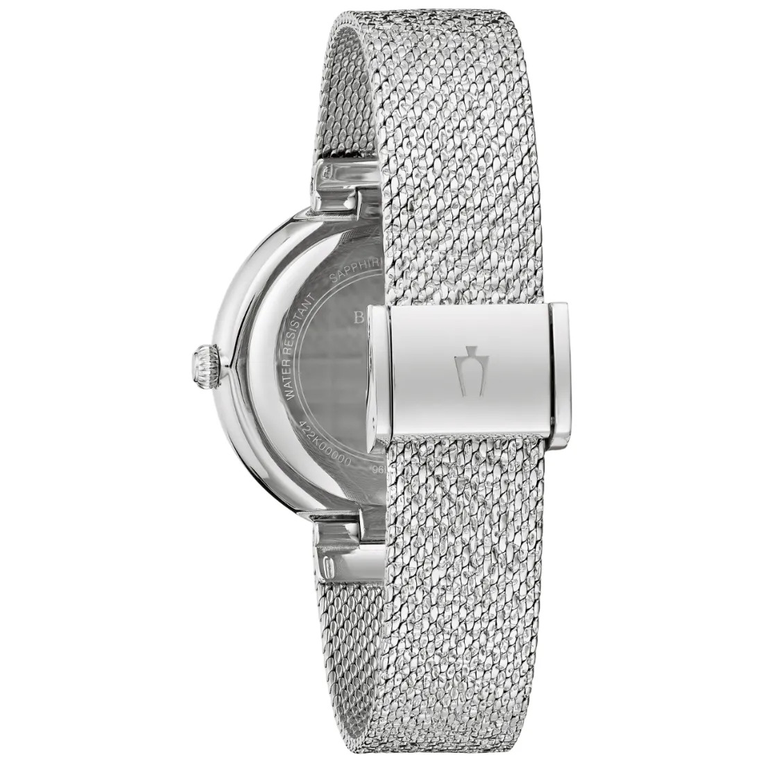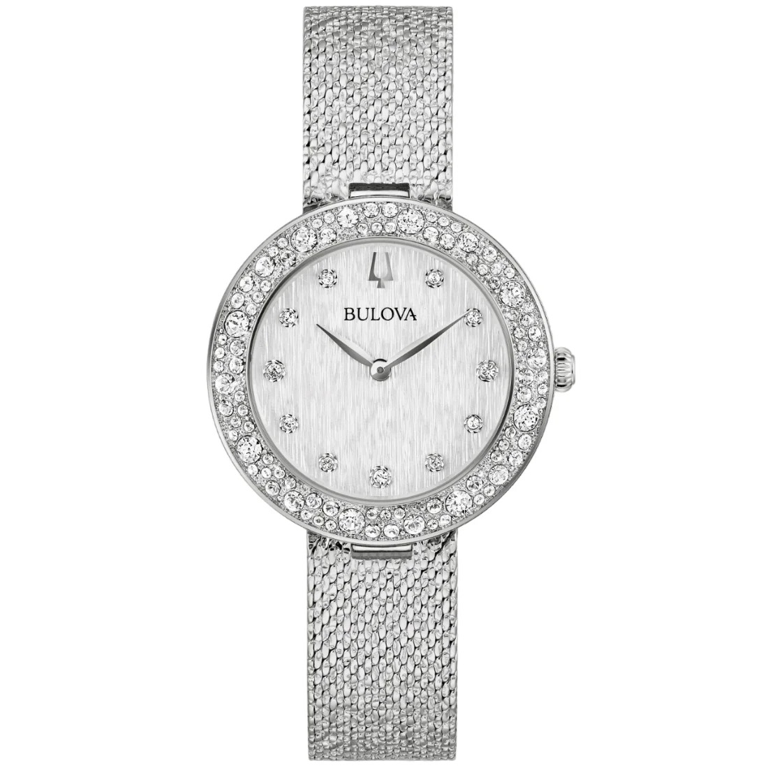 Reloj Bulova para Dama, colección Cristales. 92 cristales austriacos montados a mano de forma individual en bisel superior y 11 cristales como indicadores en carátula. Movimiento de cuarzo de 2 manecillas. Caja realizada en acero inoxidable. Correa brillante tipo mesh plateada, broche desplegable. Carátula plateada en acabado pulido, manecillas en plateado. Cristal de zafiro