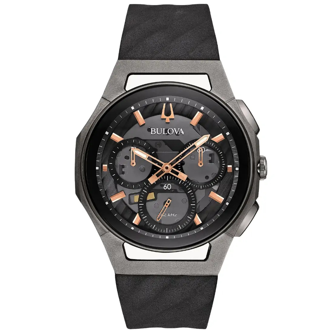 Reloj Bulova CURV para caballero. El primer movimiento cronógrafo curvo del mundo con tecnología de cuarzo de alto rendimiento, exclusiva de Bulova, con una frecuencia de vibración de 262 kHz que brinda gran exactitud. Cronógrafo que mide hasta 11 horas 59 minutos de 5 manecillas Caja de titanio y acero inoxidable. Carátula gris, indicadores y manecillas luminiscentes en oro rosa.