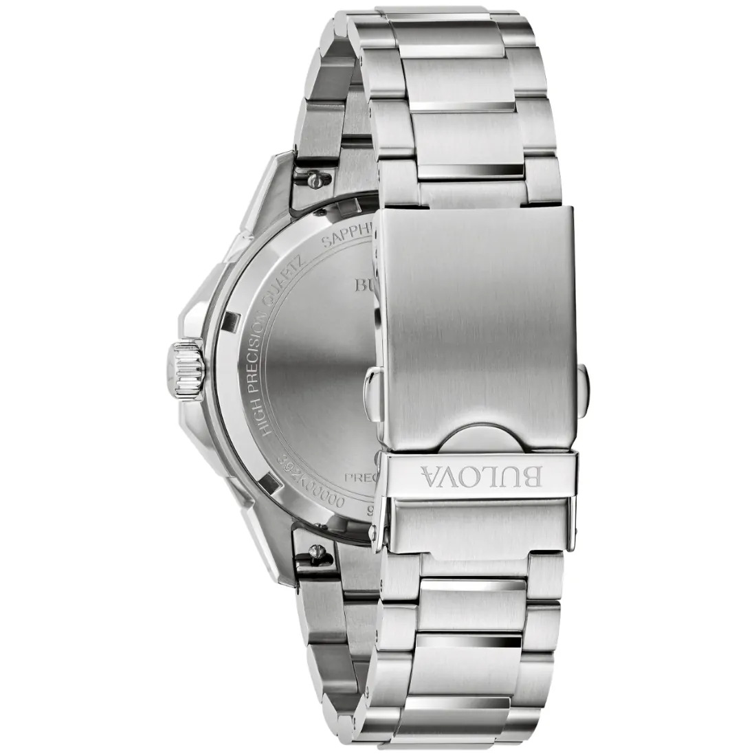 Reloj Bulova colección Marine Star para Caballero. Movimiento Precisionist de 3 manecillas y fechador. Caja en forma poligónica y brazalete realizados en acero inoxidable, broche desplegable de doble pulsador. Bisel superior unidireccional de tiempo transcurrido en acero con inserto de cerámica negro. Carátula texturizada que asemeja las olas de mar en blanco, indicadores y manecillas luminiscentes; segundero de movimiento continuo con detalle rojo en punta.