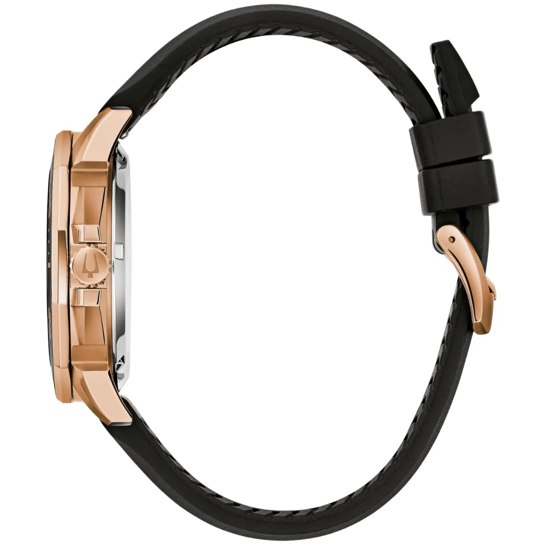 Reloj Bulova colección Marine Star para Caballero. Movimiento Precisionist de 3 manecillas y fechador. Caja en forma poligónica realizada en acero inoxidable acabado PVD oro rosa. Bisel superior unidireccional de tiempo transcurrido en tono oro rosa con inserto de cerámica café. Carátula texturizada que asemeja las olas de mar en café, indicadores y manecillas luminiscentes; segundero de movimiento continuo en tono oro rosa con detalle rojo en punta.