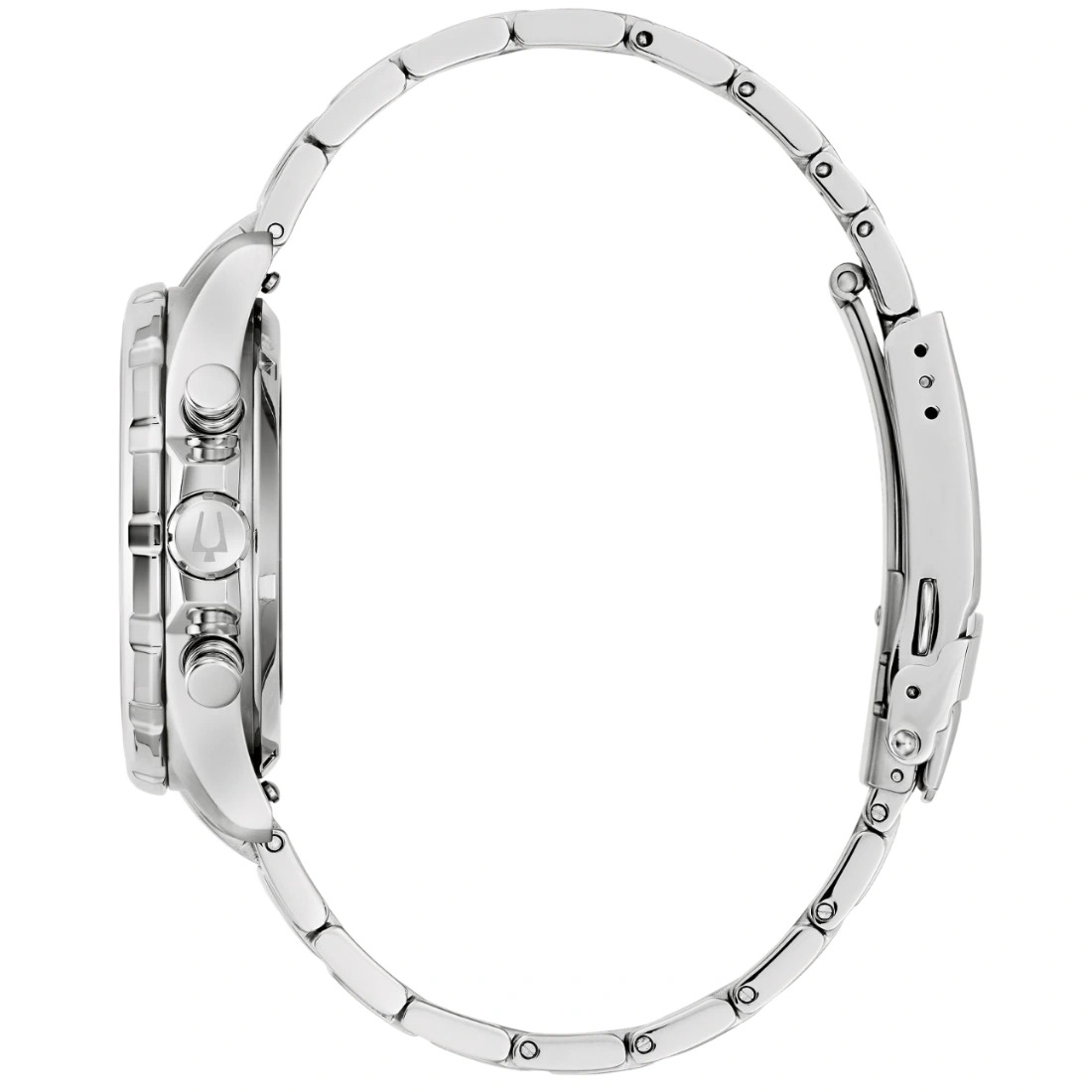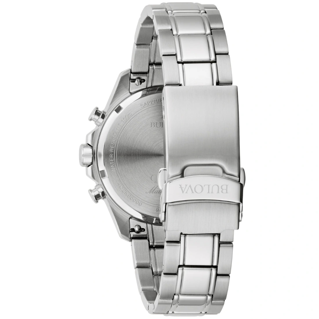 Reloj Bulova colección Marine Star series B para caballero. Movimiento cronógrafo de cuarzo de 6 manecillas y 3 subcarátulas. Caja 41 mm y brazaletes hechos de acero inoxidable, broche desplegable de pulsador. Carátula de tinte negro con manecillas y marcadores aplicados en color plata con Super-Luminova y fechador.