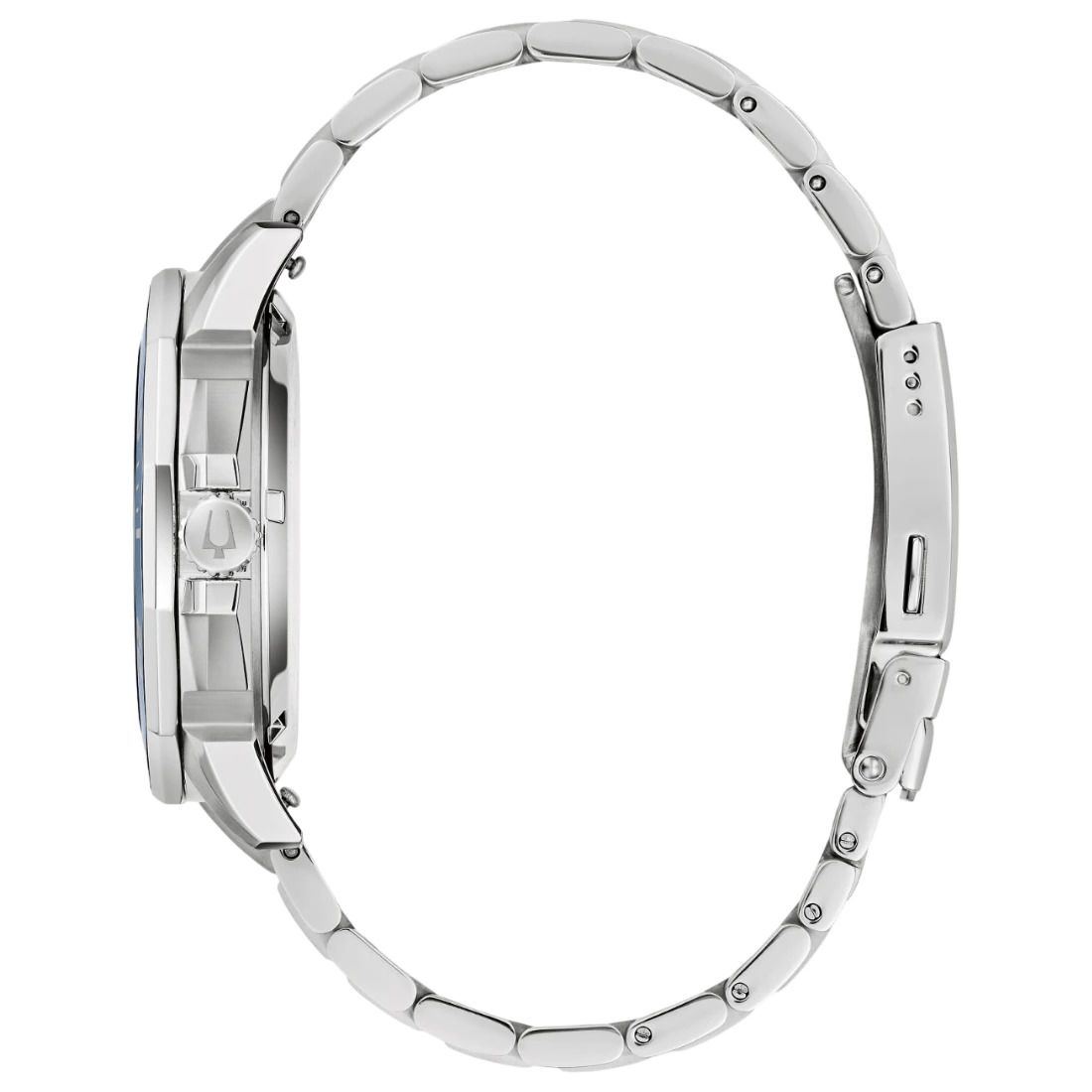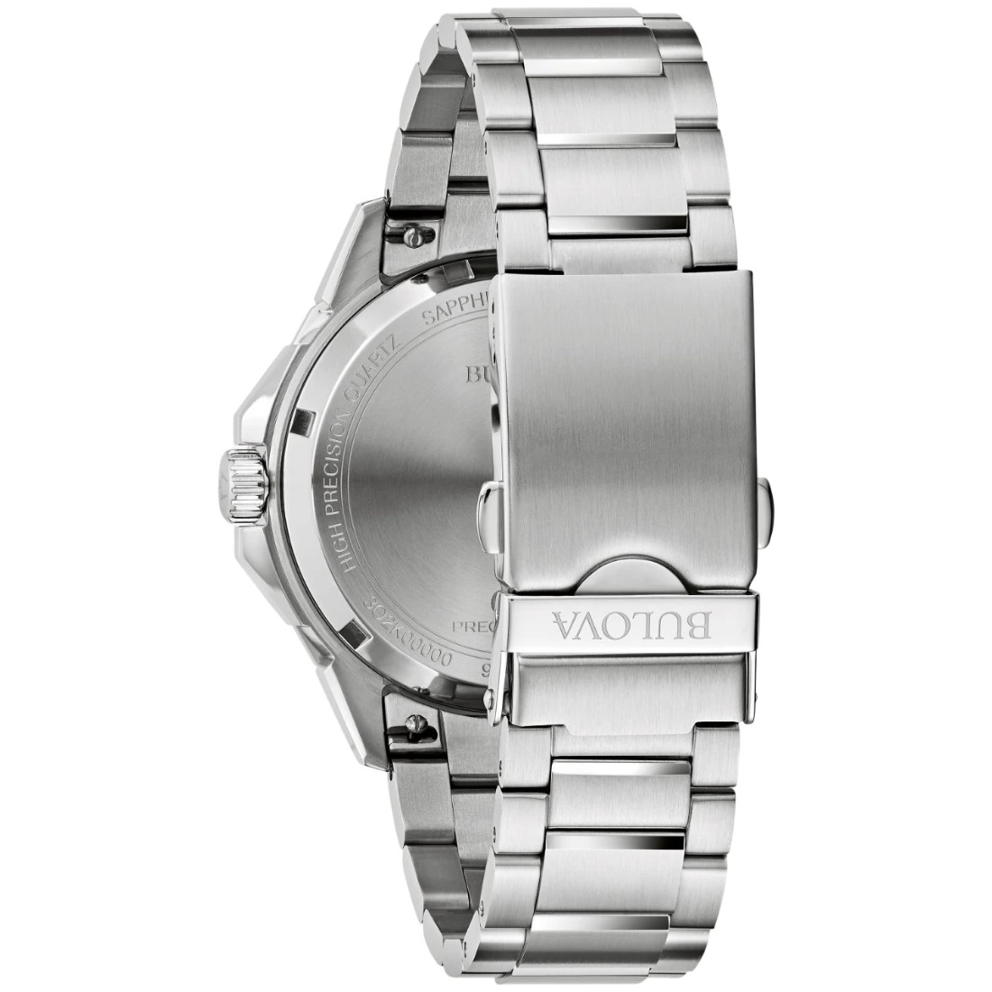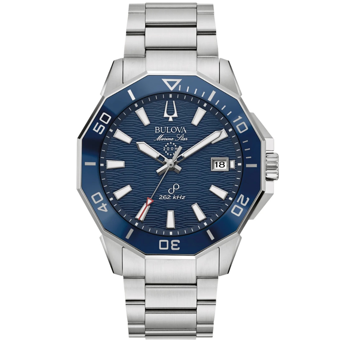 Reloj Bulova colección Marine Star para Caballero. Movimiento Precisionist de 3 manecillas y fechador. Caja en forma poligónica y brazalete realizados en acero inoxidable, broche desplegable de doble pulsador. Bisel superior unidireccional de tiempo transcurrido en acero con inserto de cerámica azul. Carátula texturizada que asemeja las olas de mar en azul, indicadores y manecillas luminiscentes; segundero de movimiento continuo con detalle rojo en punta. Cristal de zafiro con tratamiento antirreflejante.