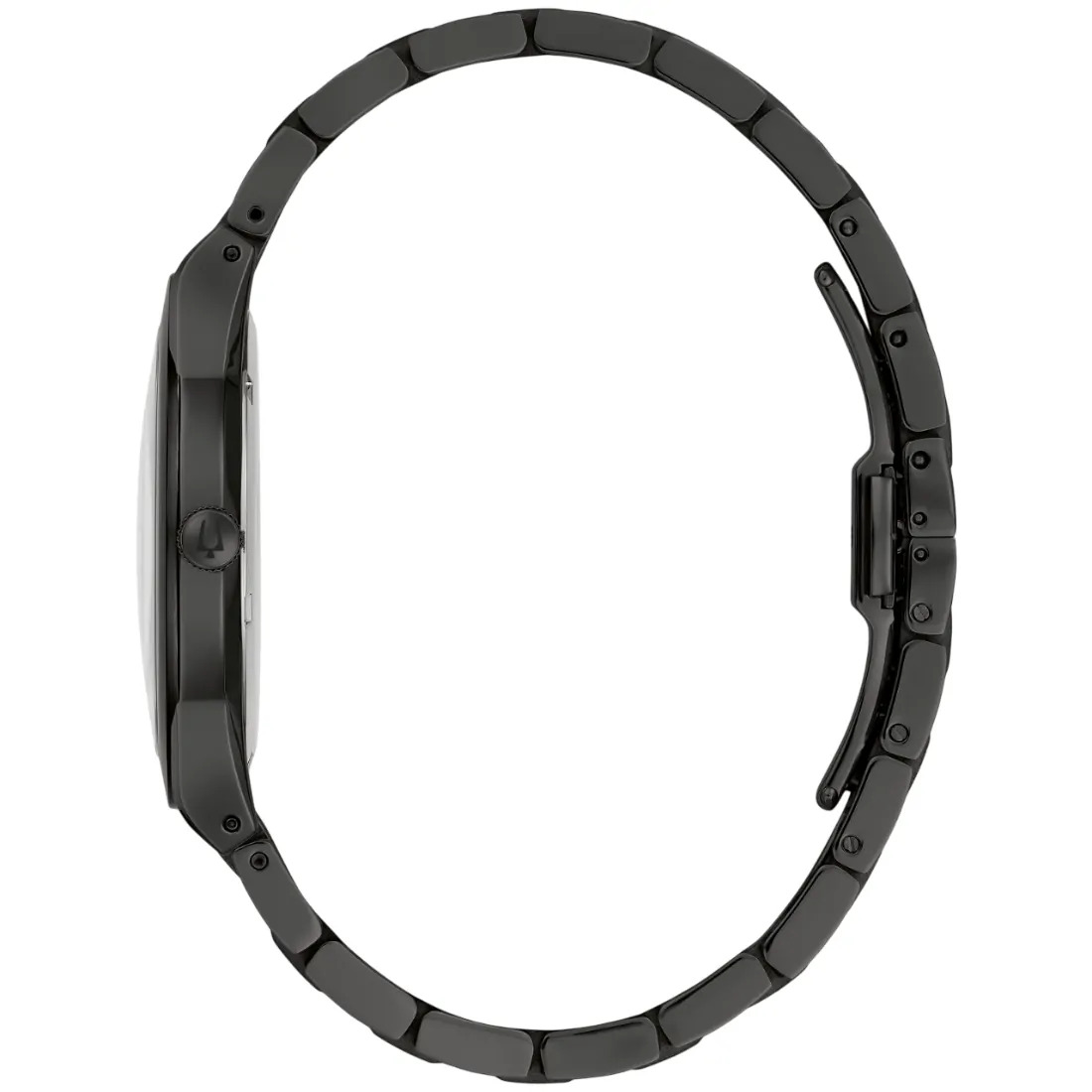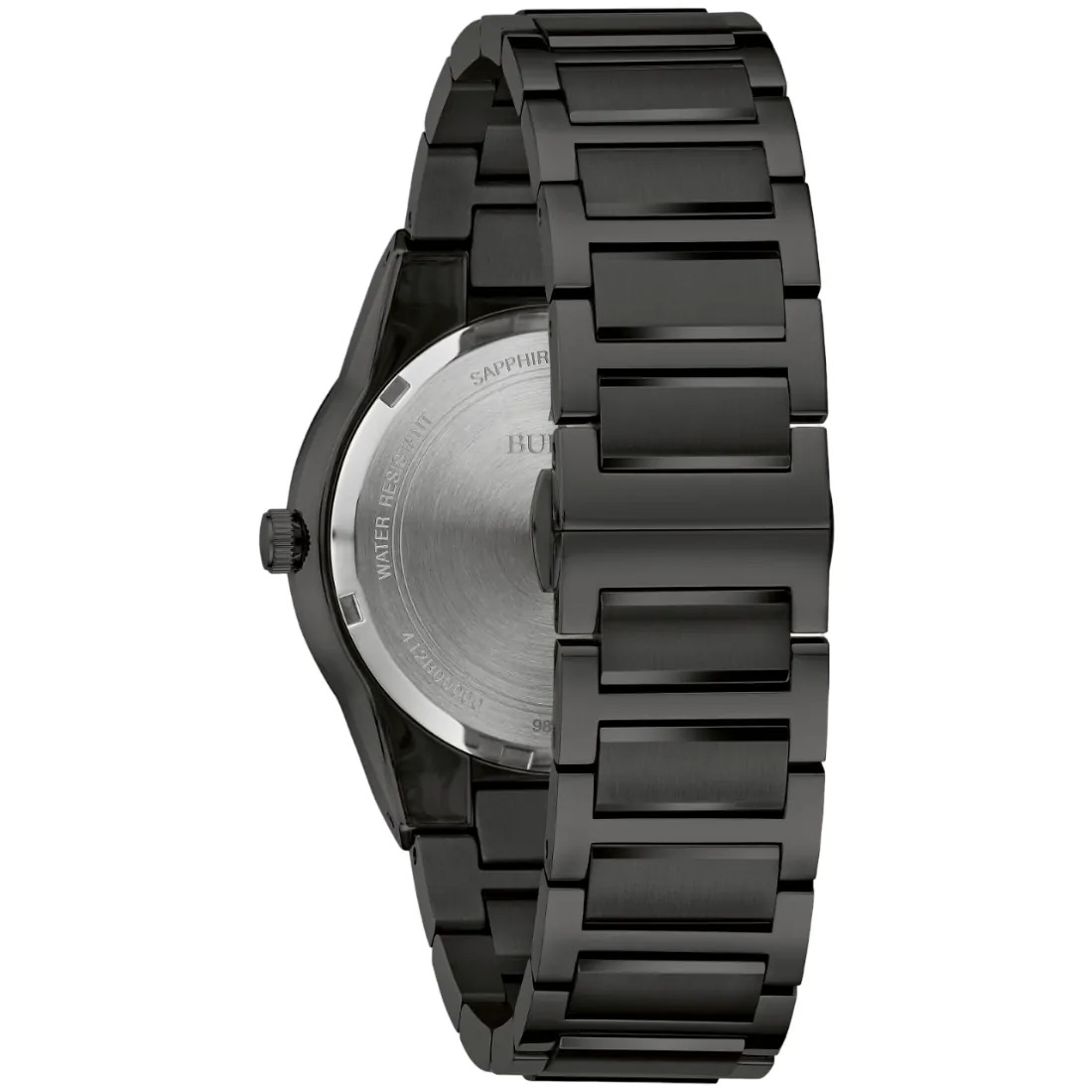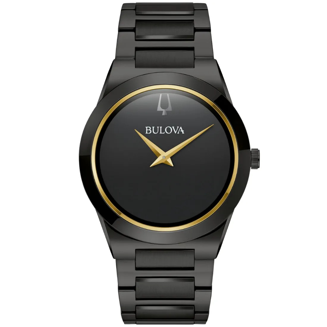 Reloj Bulova colección Millennia para Caballero. Movimiento de cuarzo de 2 manecillas. Caja y brazalete realizados en acero inoxidable acabado PVD negro, broche desplegable de doble pulsador. Carátula negra, bisel interno y manecillas en dorado. Cristal de zafiro metalizado de borde a borde.