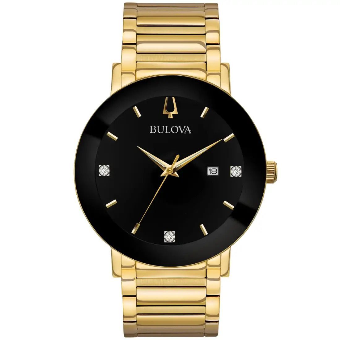 Reloj Bulova Modern para caballero.3 diamantes montados de forma individual a mano en la car tula como indicadores. Movimiento de cuarzo de 3 manecillas y fechador. Caja y brazalete realizados en acero inoxidable con acabado PVD dorado_ broche desplegable de doble pulsador. Car tula negra decorada con diamantes como indicadores_ indicadores y manecillas en dorado. Cristal mineral metalizado de borde a borde.