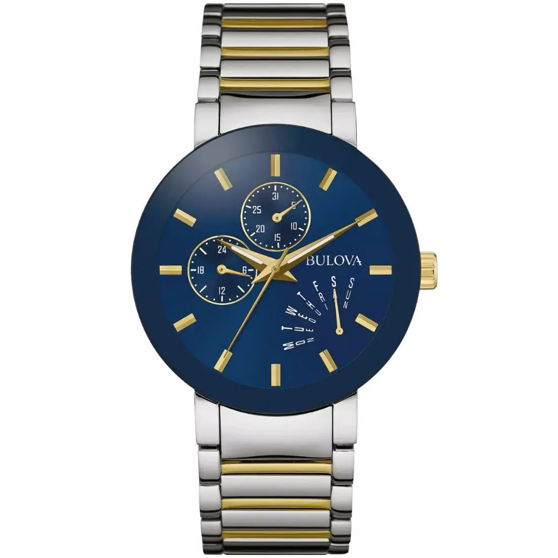 Reloj Bulova Modern para caballero. Movimiento de cuarzo de 6 manecillas y 3 subcarátulas. Caja y brazalete de acero inoxidable en dos tonos acero/dorado, broche desplegable de doble pulsador. Carátula azul, indicadores y manecillas en dorado. Cristal mineral abombado.
