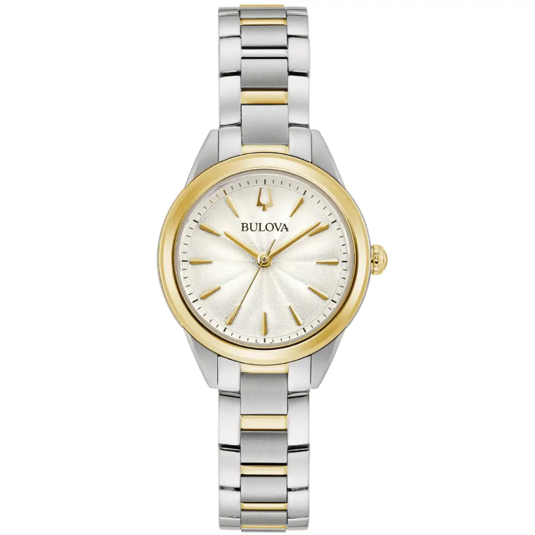 Reloj Bulova Colección Sutton para dama. Movimiento de cuarzo de 3 manecillas. Caja y brazalete realizados en acero inoxidable, dos tonos acero/dorado, broche desplegable de doble pulsador. Bisel y corona en dorado, Carátula dorada, indicadores y manecillas en dorado. Cristal mineral.