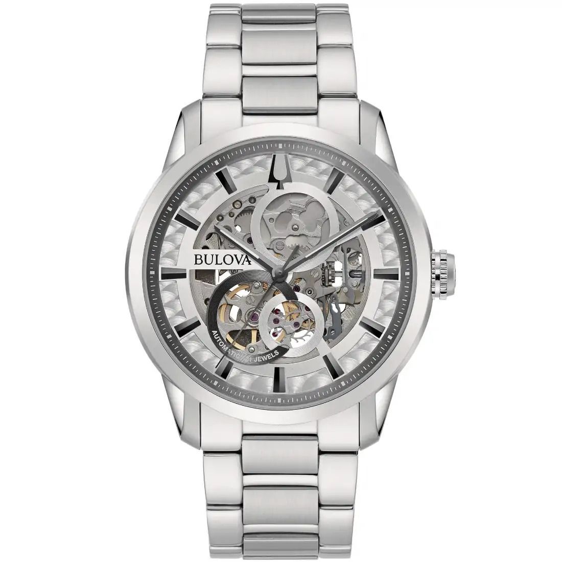 Reloj Bulova Colecci¢n Sutton para caballero. Movimiento mec nico de cuerda autom tica de 3 manecillas. Caja y brazalete realizados en acero inoxidable_ broche desplegable de doble pulsador. Car tula plateada esqueletada que permite ver el mecanismo en funcionamiento_ indicadores y manecillas en plateado. Cristal mineral abombado_ Tapa transparente.