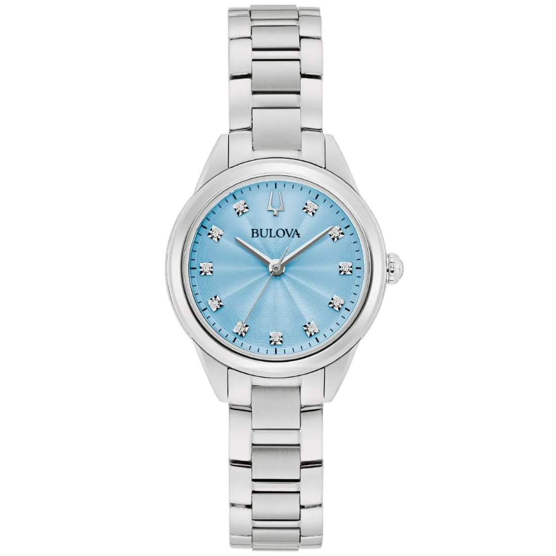 Reloj Bulova colección Sutton para Dama. 11 diamantes montados a mano como indicadores. Movimiento de cuarzo de 3 manecillas. Caja y brazalete realizados en acero inoxidable, broche desplegable de doble pulsador. Carátula en Madre Perla azul con efecto texturizado, indicadores y manecillas en plateado. Cristal de zafiro.