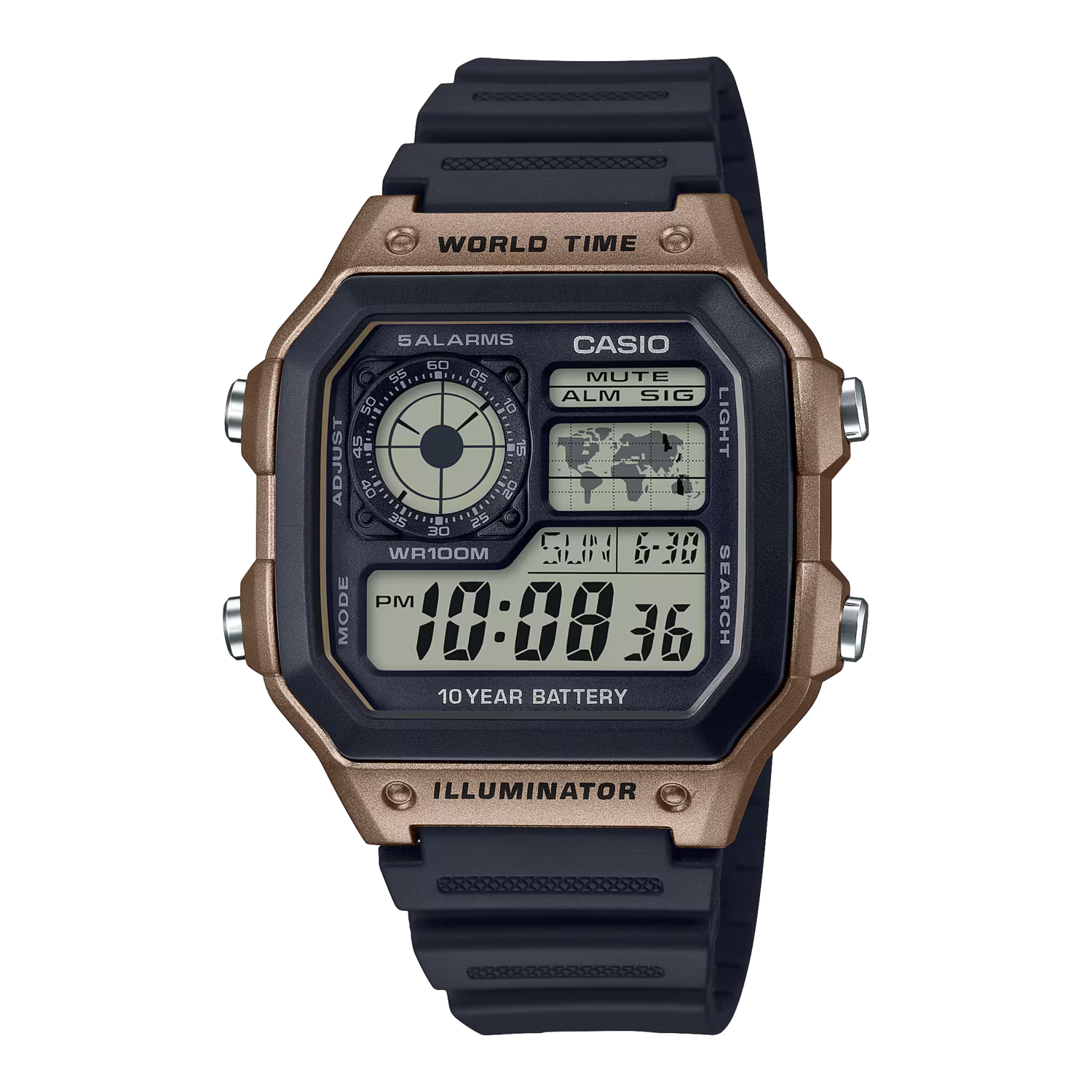 BATERÍA DE 10 AÑOS DE DURACION  • Cronómetro de 1/100segundos • Mapa del mundo para la hora mundial • 5alarmas • Luz LED • Resistente al agua hasta 100 metros