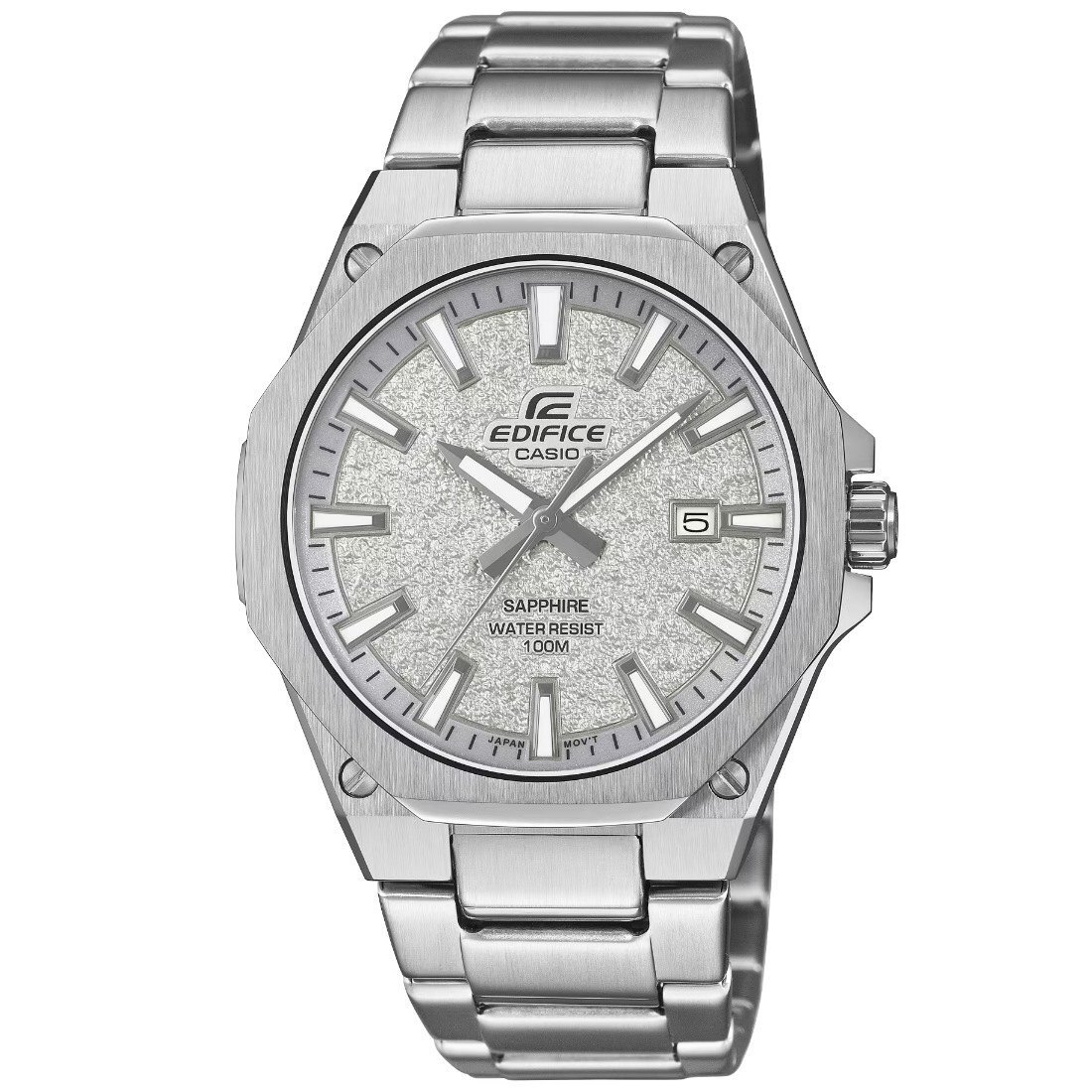Tamaño de la caja (largo × ancho × alto): 44.8 × 39.9 × 7.8 mm Material de la caja/bisel: Acero inoxidable Peso: 110 g Correa de acero inoxidable Broche de una pulsación y triple pliegue Resistencia al agua de 100 m Fuente de alimentación: pila