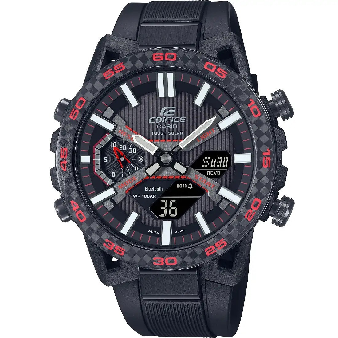Tome el control de la velocidad y la inteligencia con una combinaci¢n anal¢gica-digital con funcionamiento con energ¡a solar EDIFICE. Inspirado en la suspensi¢n de los autom¢viles de formula_ el SOSPENSIONE ECB-2000 es el primer EDIFICE con una carcasa de resina reforzada con fibra de carbono_ gracias a un dise¤o de carcasa £nico que dispone las orejetas en una configuraci¢n de cuatro brazos. Las orejetas tambin est n reforzadas con fibra de carbono_ lo que aporta el verdadero esp¡ritu de los deportes motorizados tanto al dise¤o como a los materiales de este reloj.