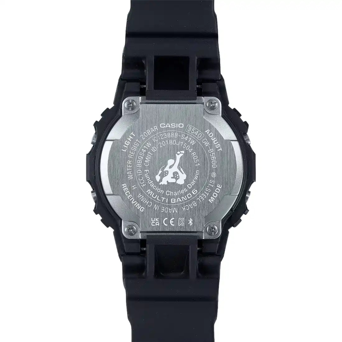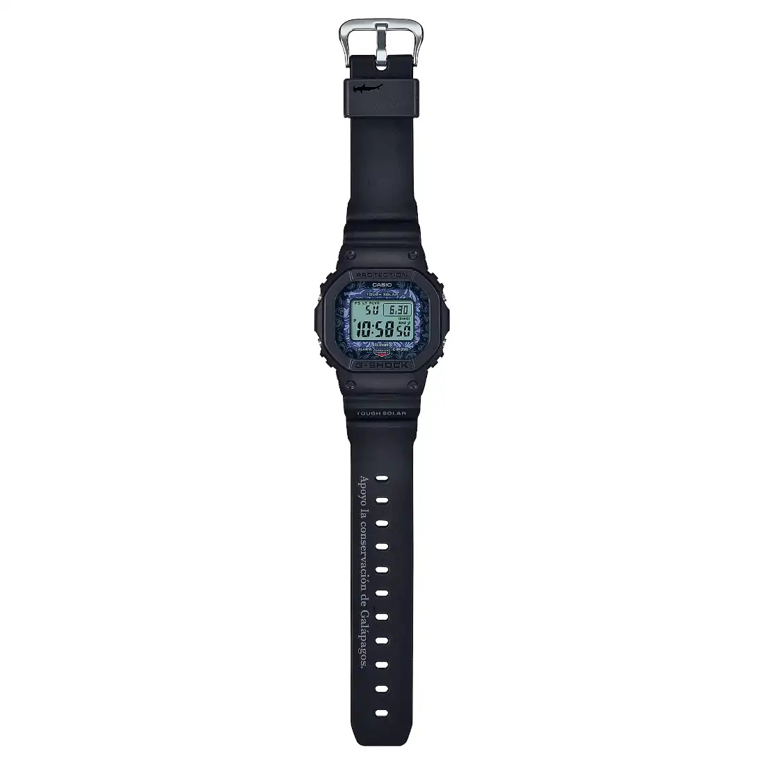 Declare su compromiso con las islas Gal pagos gracias a una colaboraci¢n muy especial que celebra a la Fundaci¢n Charles Darwin. La carcasa y la correa est n hechas de resinas de base biol¢gica para honrar el compromiso con el medioambiente que comparten G-SHOCK y esta importante fundaci¢n. Este compromiso tambin se capta en el dise¤o del dial_ el cristal del reloj impreso_ el sujetador de la correa y la pantalla LED con retroiluminaci¢n_ todo inspirado en los tiburones martillo que habitan en las islas Gal pagos.