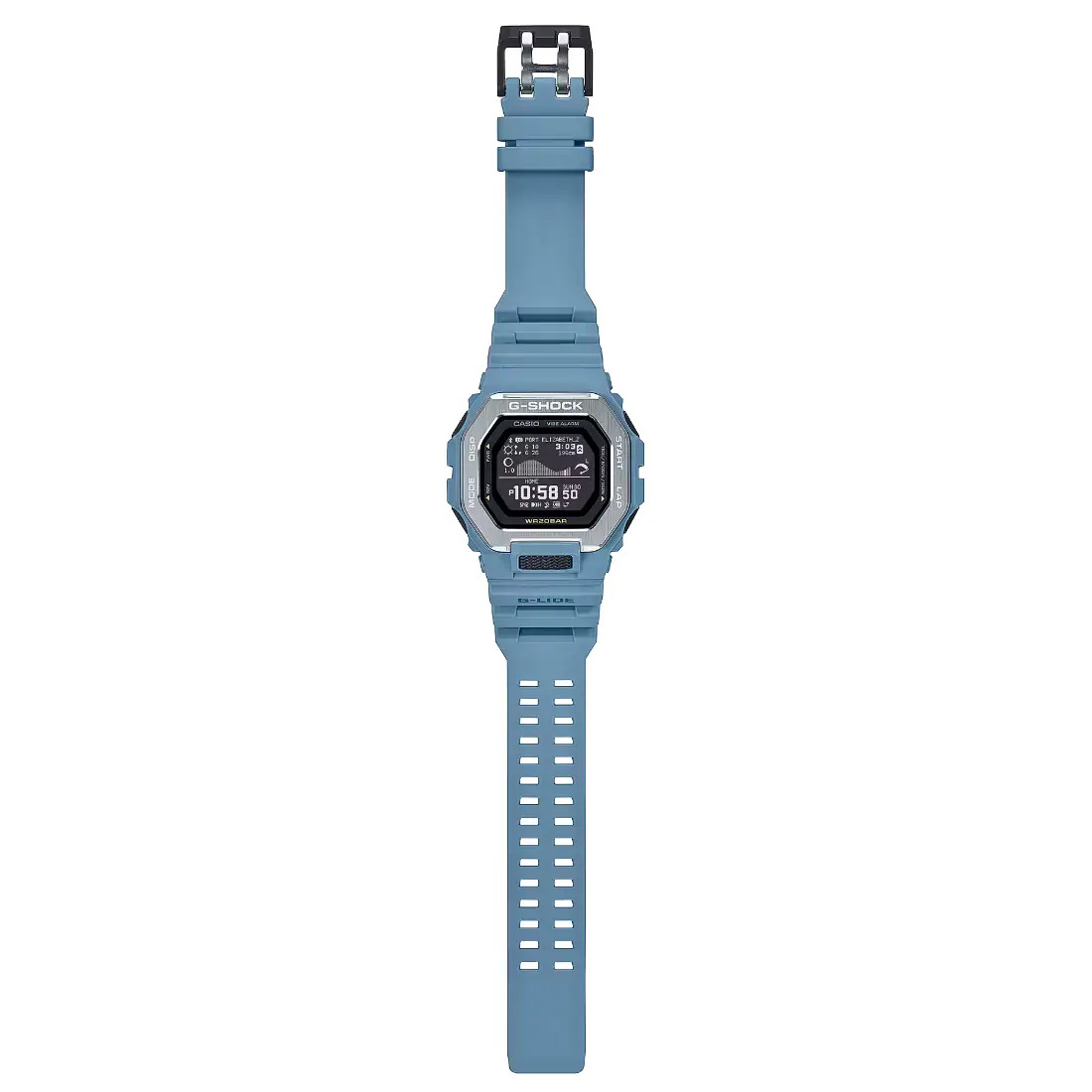 Ll‚velo a las olas con el reloj GBX-100 vinculado a tel‚fonos inteligentes inspirado en los colores naturales de la playa. Presentamos la l¡nea deportiva G-LIDE para los mejores surfistas y fan ticos de los deportes extremos del mundo. Solo seleccione uno de los 3300 puntos de surf de todo el mundo en la aplicaci¢n dedicada para tel‚fonos inteligentes y env¡e al reloj patrones de mareas_ condiciones de luz diurna y otra informaci¢n espec¡fica de la ubicaci¢n.