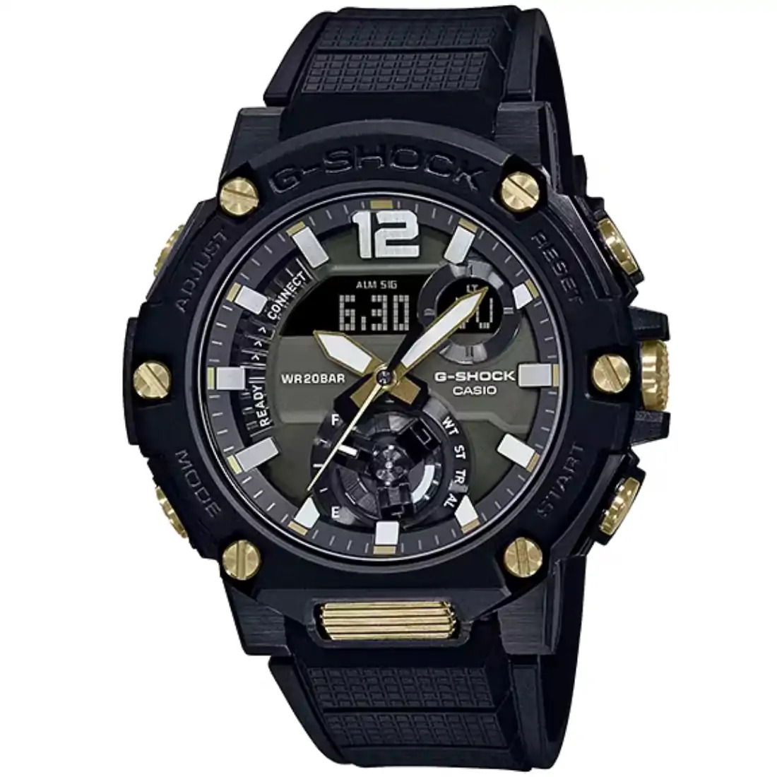 Un modelo con un estilo resistente basado en un modelo G-STEEL que utiliza la estructura de protecci¢n de carbono de G-SHOCK_ que sigue evolucionando en la b£squeda de resistencia. Un modelo cubierto con un dise¤o resistente y divertido_ t¡pico de G-SHOCK_ con un dial de disco que muestra el modo actual y la carga restante en la posici¢n de las 6_ adem s de un bot¢n frontal de dise¤o resistente. Adem s_ el gr fico digital redondo en la posici¢n entre las 1 y 2_ que es asimtrico con el dial de disco_ proporciona funcionalidad y dise¤o_ junto con la pantalla LCD digital en la posici¢n de las 12.