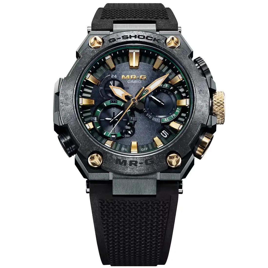 Presentamos el impresionante reloj de la l¡nea MR-G_ la insignia de la marca G-SHOCK. Sum‚rjase en la resistencia y la belleza del coraz¢n de la artesan¡a japonesa con la meticulosa atenci¢n a la construcci¢n_ la funci¢n_ los materiales y los acabados que son el sello distintivo de MR-G. El modelo MRG-B2000RG se inspira en el color japon‚s tradicional del kurogane-iro_ el profundo tono azul verdoso que adquiere el hierro cuando se calienta para fabricar armaduras y cascos tradicionales japoneses. Se utiliza un proceso de endurecimiento en capas profundas y un revestimiento de carbono verde tipo diamante (DLC) que se aplica al exterior de titanio para capturar este sutil tono.