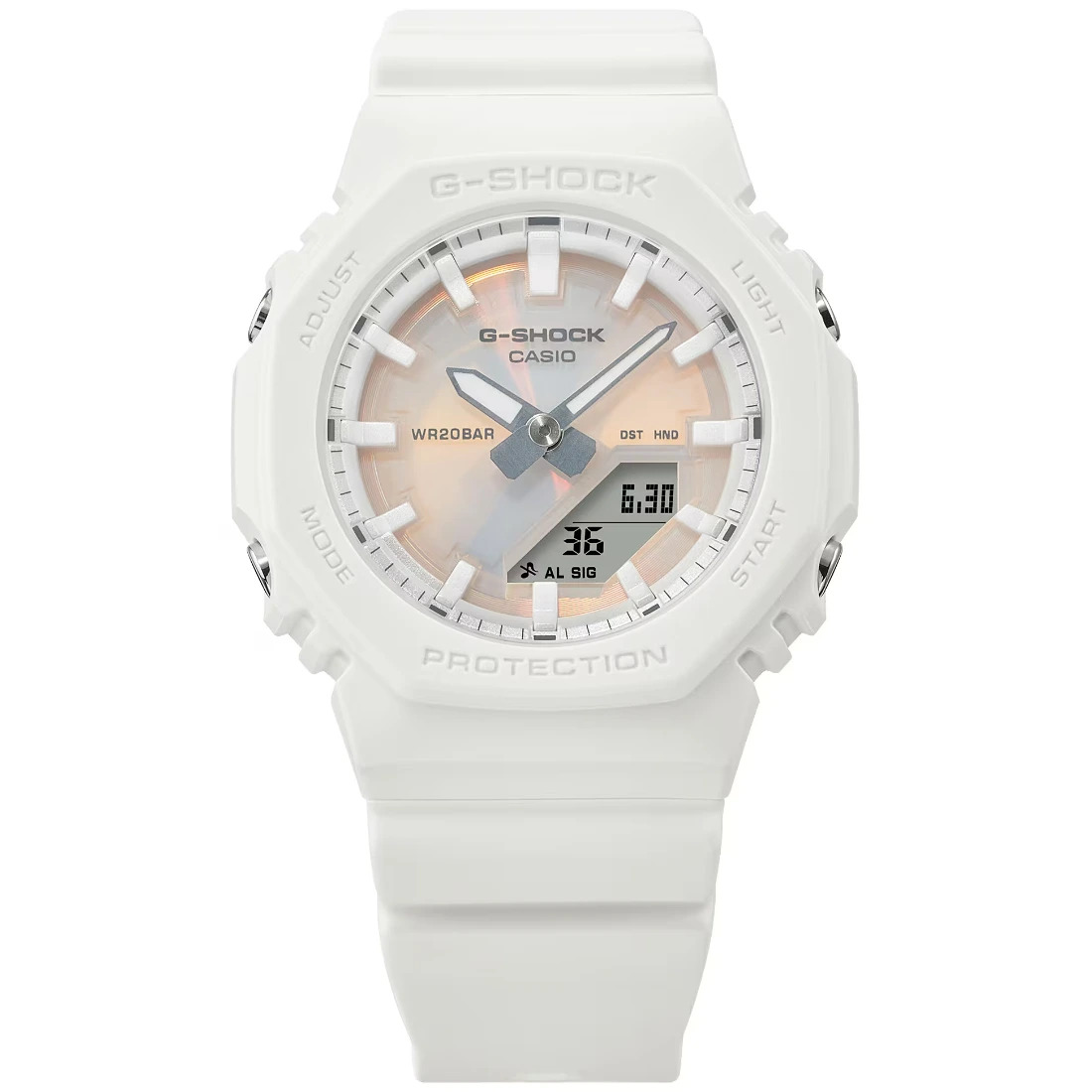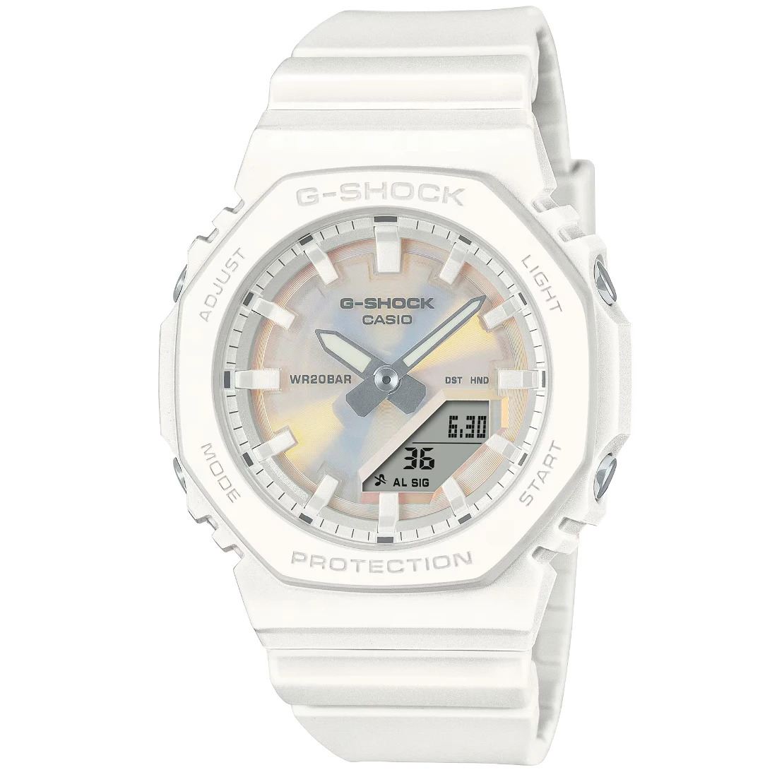 Atr‚vete a lucir diferente con el nuevo GMA-P2100_ el reloj G-SHOCK que combina dise¤o urbano_ innovaci¢n y compromiso ambiental. Su esfera polarizada deslumbra con destellos multicolores que cambian seg£n la luz_ aportando un efecto £nico y llamativo que convierte cualquier look en una declaraci¢n de estilo.