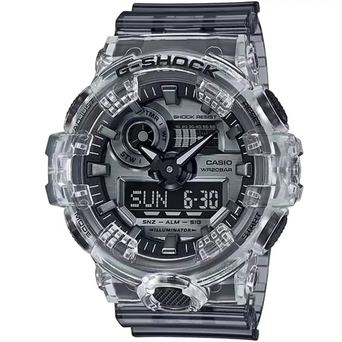 G-SHOCK es la marca de relojes que siempre busca formas de incorporar ¡conos de la cultura mundial en dise¤os emocionantes y novedosos. Este nuevo modelo se cre¢ a partir de la combinaci¢n entre la popular resina semitransparente y colores met licos para generar una mezcla que refleja la fusi¢n entre la apariencia de los a¤os 80 y la moda de la actualidad. El modelo base es el GA-700 din mico. Este modelo cuenta con colores de dos tonos que combinan los matices brillantes con la resina semitransparente de la carcasa y la correa.