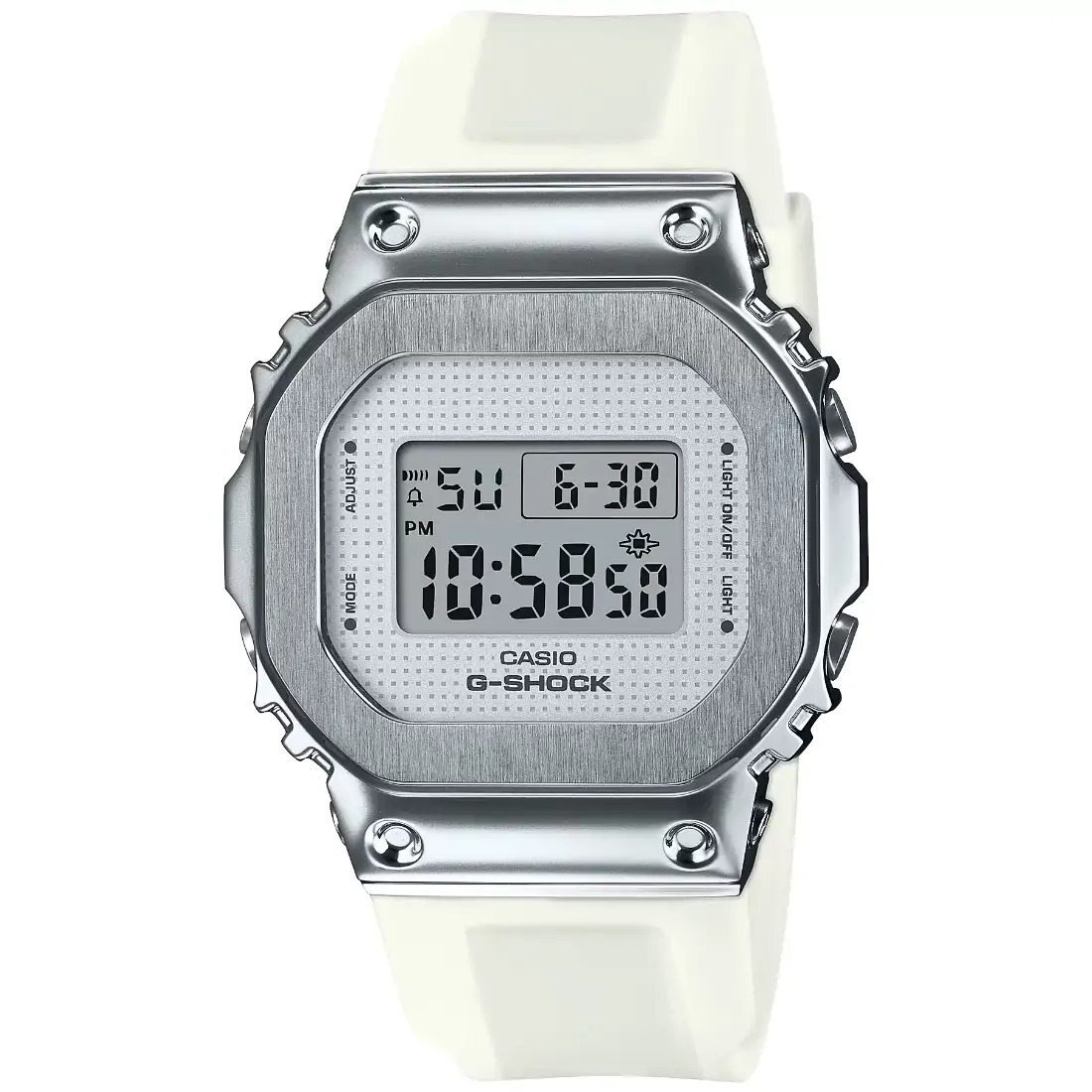 Un modelo de tama¤o reducido de la ic¢nica serie G-Shock 5600 con un acabado met lico lujoso. El dise¤o cuadrado del GM-5600_ que se ha utilizado desde el primer modelo_ se redujo para lograr un ajuste ligero y c¢modo. La cubierta del marco es met lica y la correa de resina transl£cida es una elegante correa G-SHOCK en blanco.