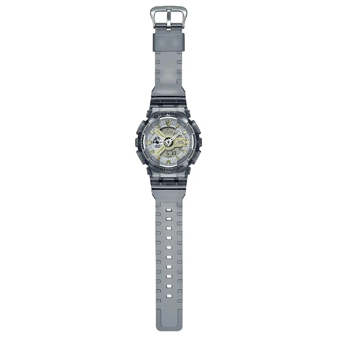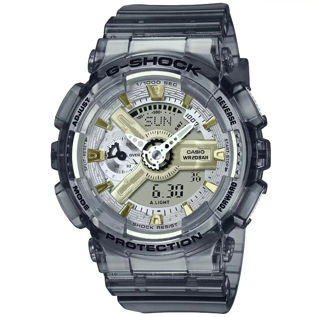 Brillo met lico con un toque moderno_ ligeramente m s peque¤o para un ajuste refinado en mu¤ecas m s delgadas. Estos dise¤os compactos basados en el popular GA-110 y GA-120 aportan translucidez met lica al popular dise¤o G-SHOCK anal¢gico-digital. La correa transparente y la carcasa en un verde o gris sutil se combinan con componentes de esfera de dos tonos en dorados y plateados para brindar un estilo contempor neo_ fluido y equilibrado.