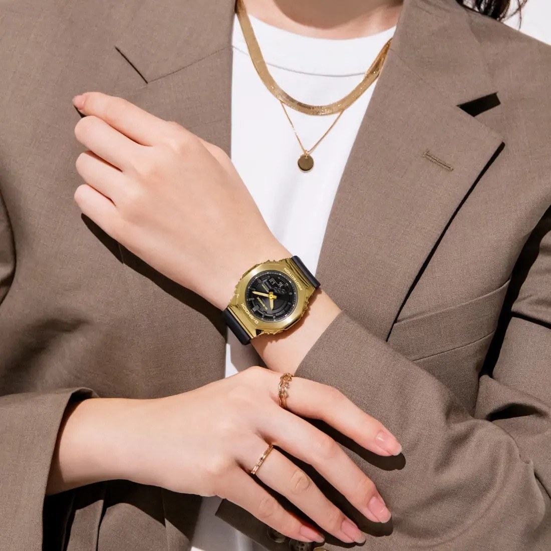 Consiga una cubierta met lica con un G-SHOCK dorado sobre negro en un perfil m s peque¤o y compacto. Acabado en ba¤o de iones en oro_ el marco met lico es todo un s¡mbolo de lujo. Los botones y la hebilla_ tambin con ba¤o de iones en oro_ se colocan sobre el negro para lograr un contraste que hace brillar el metal. El lujo del oro combinado con la fuerza del negro en una belleza reluciente que es £nica para usted.