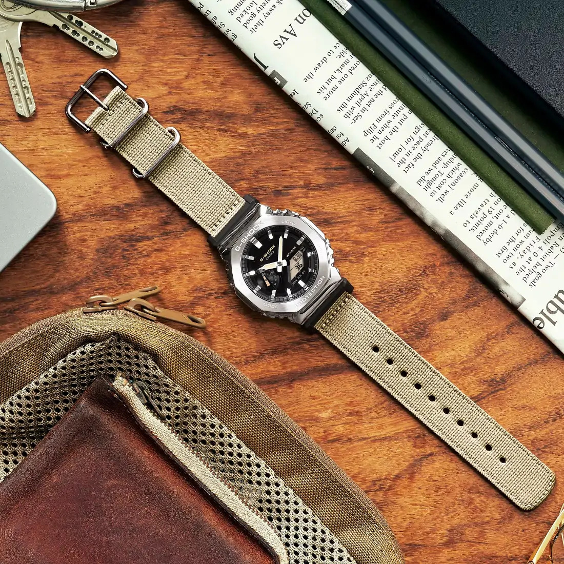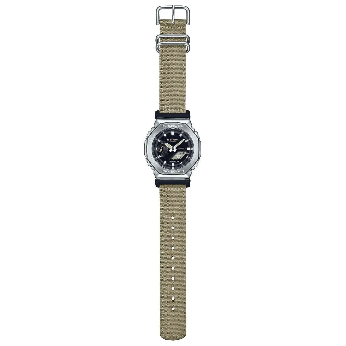 Agregue un toque funcional a su estilo con un G-SHOCK de la colecci¢n Utility Metal. Estos innovadores relojes toman la ic¢nica forma octagonal y el dise¤o met lico de la l¡nea GM-2100 y lo acompa¤an con una correa de tela casual en un color funcional que combina con cualquier atuendo. El llamativo contraste del metal y la tela ofrece un estilo s¢lido que es pura resistencia y sofisticaci¢n casual.