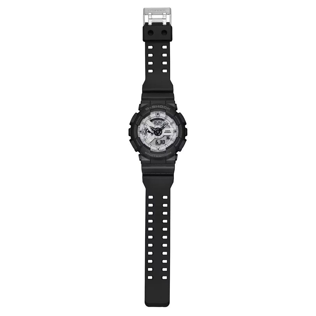 El G-SHOCK en blanco y negro es la combinaci¢n perfecta de audacia y elegancia. Su base negra azabache se complementa con un brillante dial blanco de deposici¢n de vapor_ creando un contraste monocrom tico £nico.