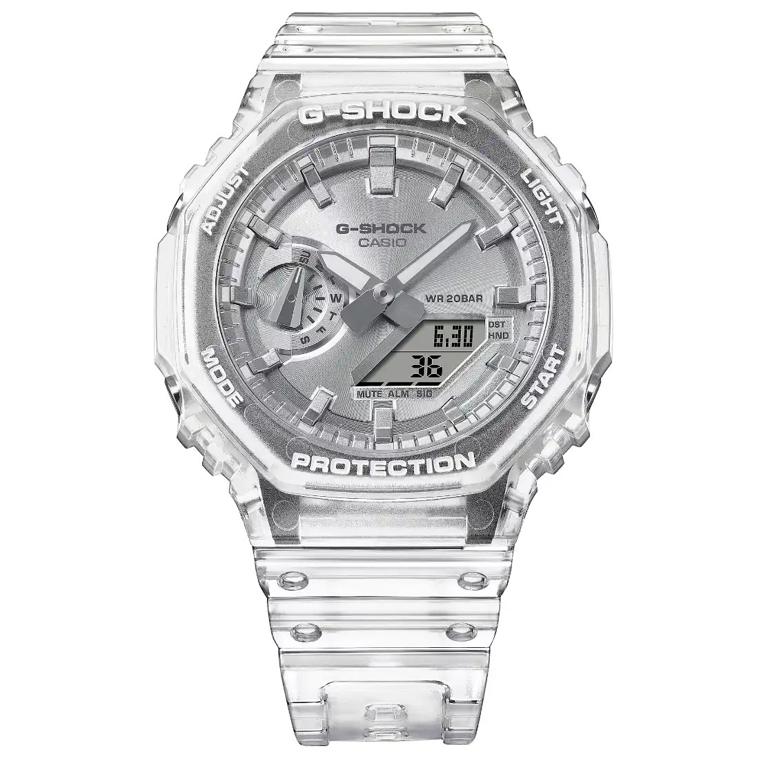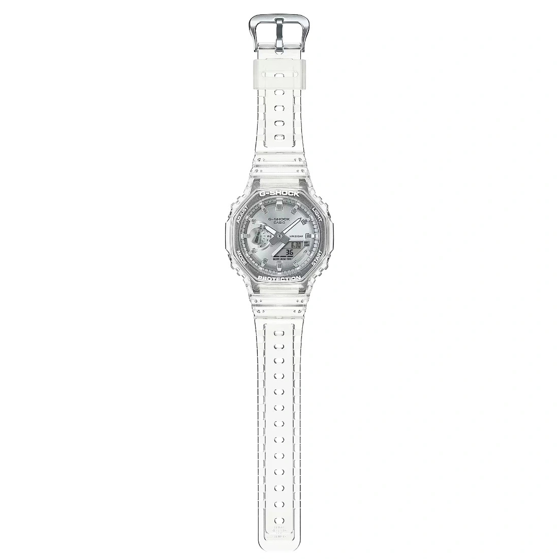 El color brillante y la transparencia fresca del GA-2100BM. El GA-2100 con marco octogonal tiene un dial con acabado met lico por deposici¢n de vapor en un color popular_ plateado_ junto con una correa transparente para darle una apariencia fresca y confiada. Este colorido reloj es un excelente accesorio cuando desea expresar su estilo casual m s urbano.