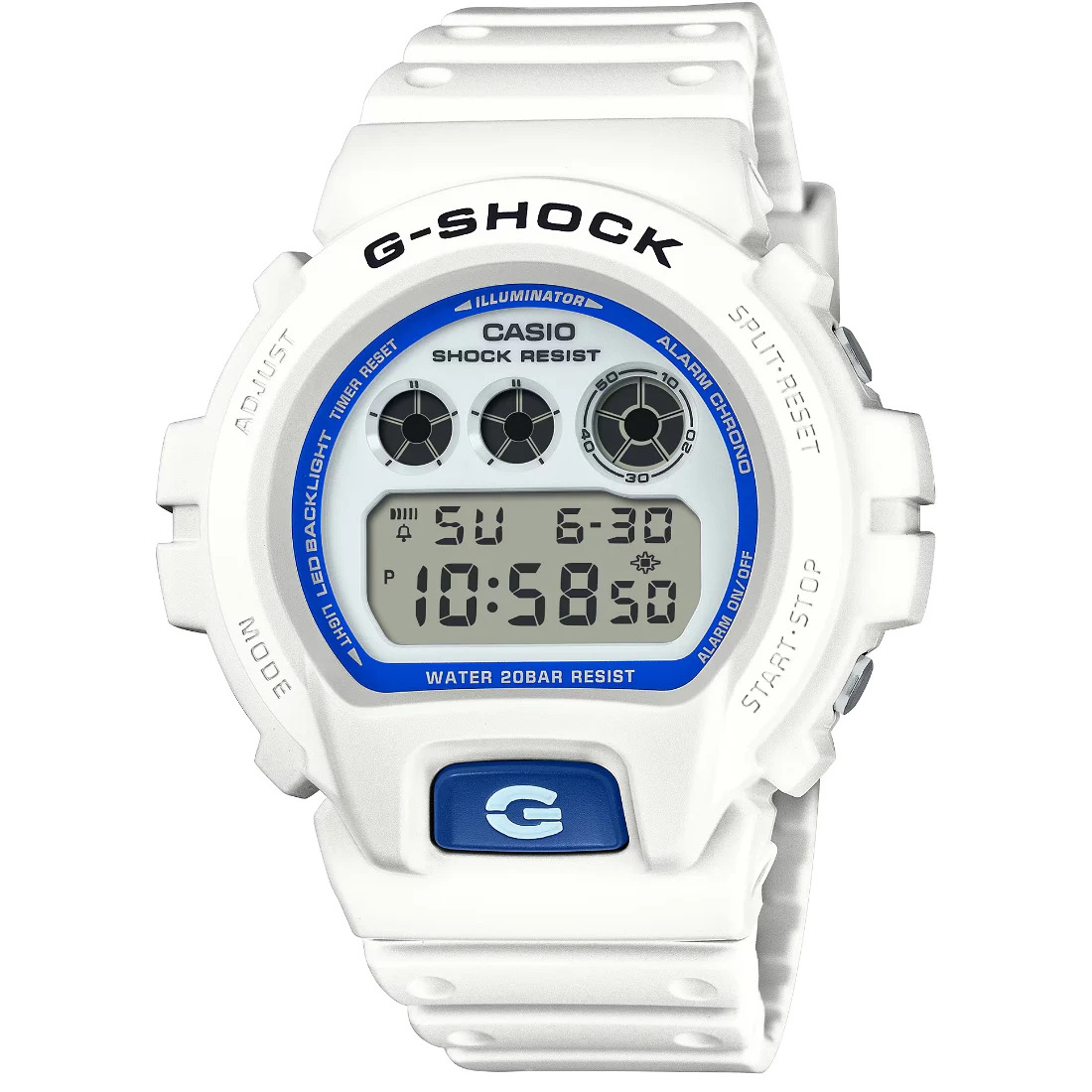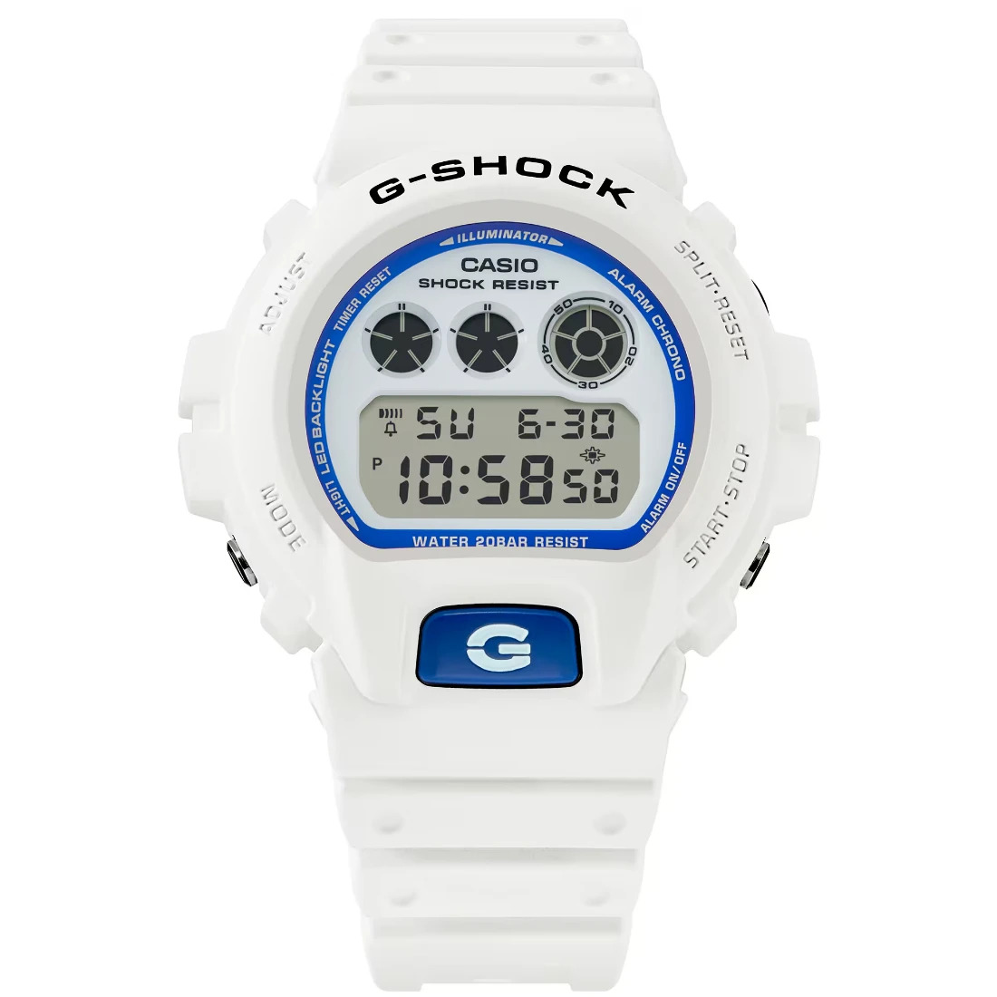 Sumrgete en el esp¡ritu del verano con el G-SHOCK blanco y azul_ inspirado en los paisajes marinos. La esfera azul fosforescente brilla en la oscuridad_ recordando la magia del plancton bioluminiscente flotando bajo las olas. Su combinaci¢n de tonos blancos y azules refleja la transici¢n natural del d¡a en la playa: del resplandor del sol a los matices suaves del anochecer. Un dise¤o que captura la esencia del mar y se adapta con estilo tanto a ambientes relajados como a escenarios urbanos.