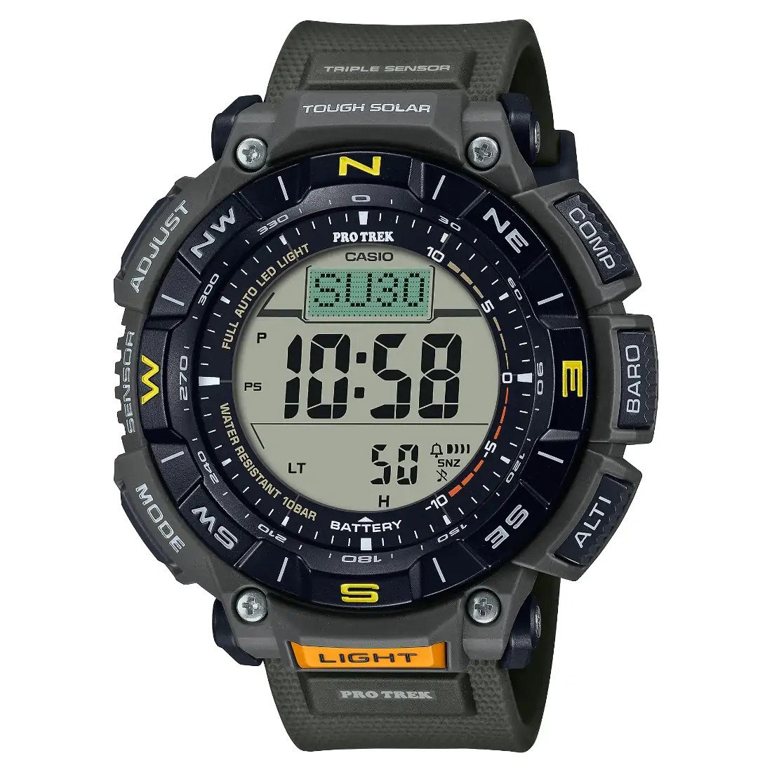 Tamaño de la caja (L× W× H): 54.7 × 51.7 × 15.1 mm Material de la caja/bisel: Resina de base biológica Peso: 54 g Correa de uretano suave (resina de base biológica) Resistente a bajas temperaturas (-10°C / 14°F) Resistencia al agua de 100 m Fuente de alimentación: energía solar Altímetro Barómetro Brújula Termómetro