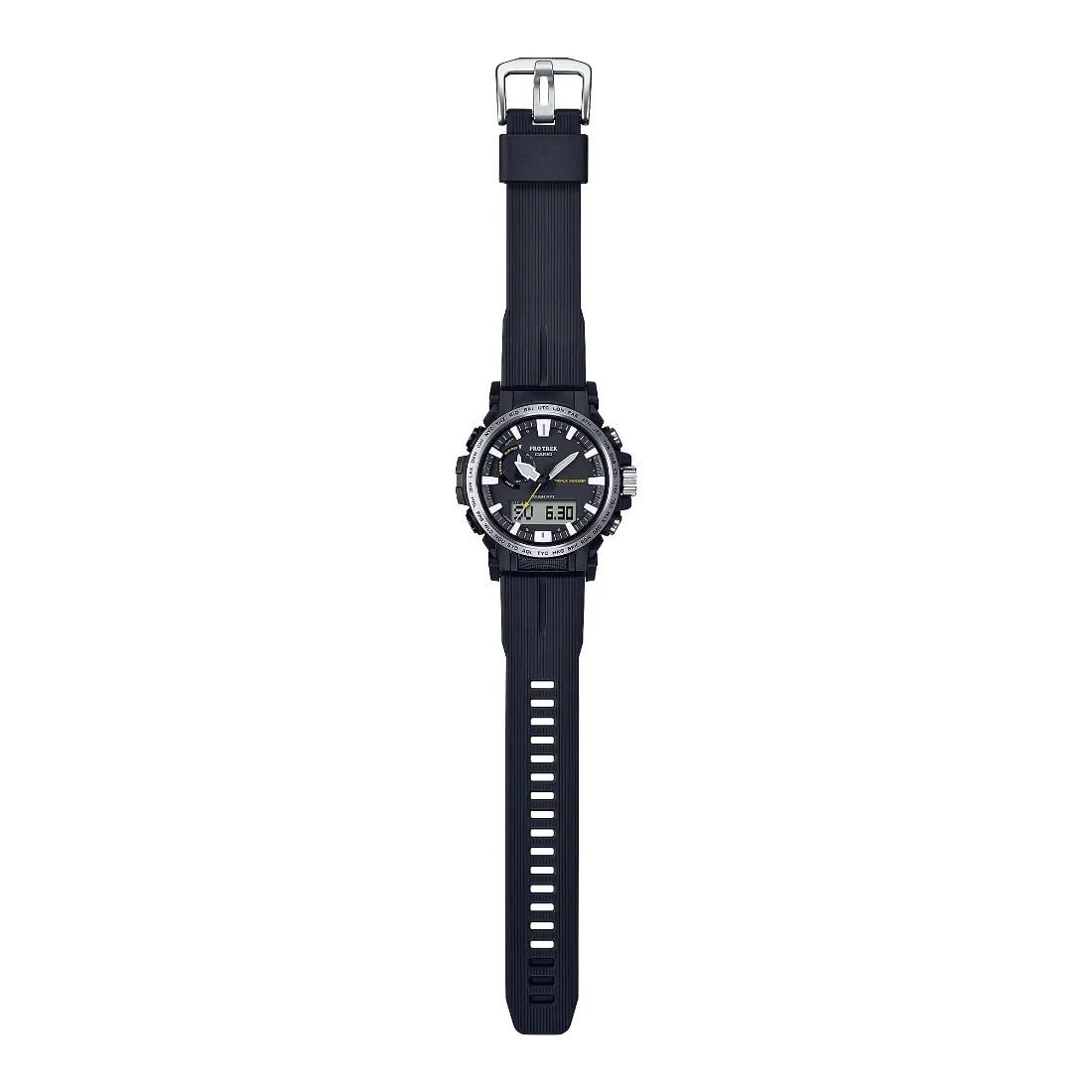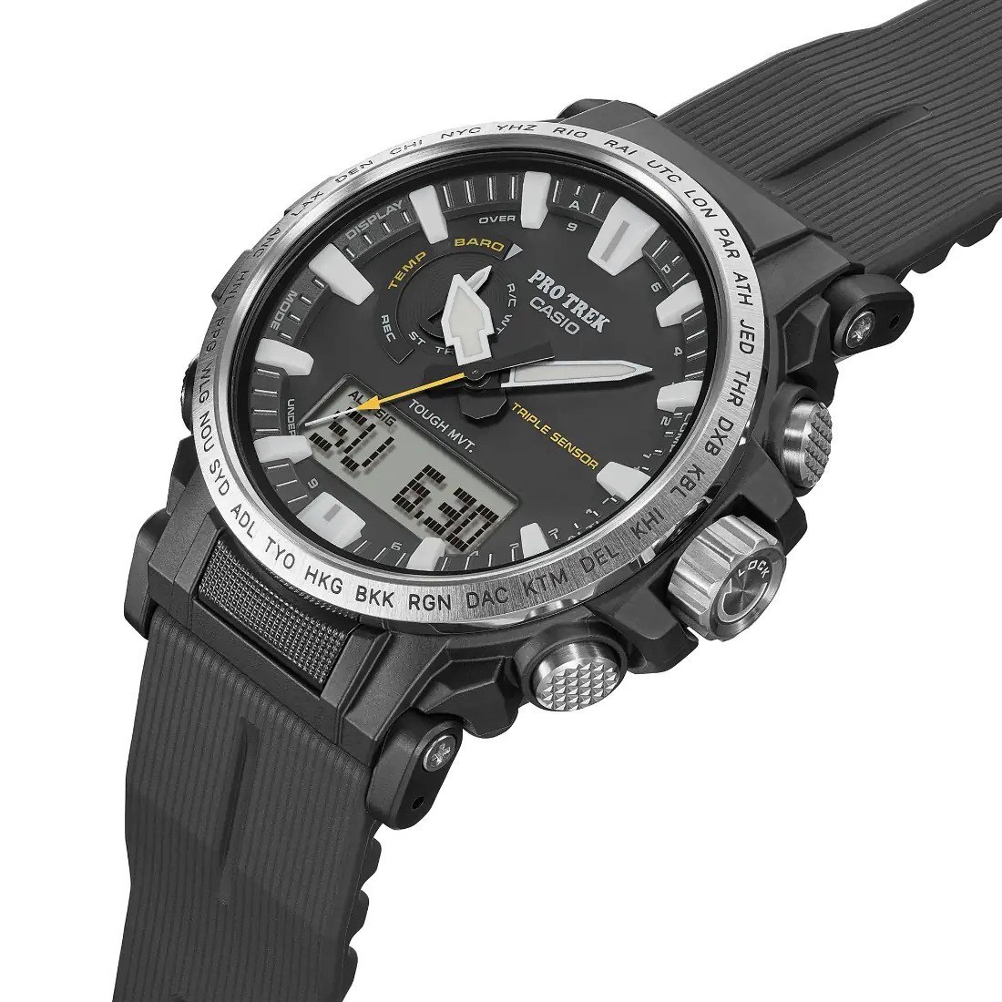 Hora mundial para 29 zonas Cronómetro Temporizador con cuenta regresiva 5 alarmas diarias Señal de hora Luz LED doble Función de silencio Corrección automática de la posición inicial de la aguja Función de ahorro de energía Indicador de carga de pila Precisión: h15 segundos por mes (sin señal de calibración) Característica de cambio de las agujas (manual o automático (durante la medición de la presión barométrica, la altitud y la temperatura)) Funciones clásicas de reloj: Analógica: 3 manecillas (hora, minuto [la manecilla se mueve cada 10 segundos], segundo) Digital: horas, minutos, segundos, a. m./p. m., mes, fecha, día Recepción de señal de calibración de hora Recepción automática hasta seis* veces al día (las recepciones automáticas restantes se cancelan en cuanto tiene lugar una recepción exitosa) * 5 veces al día para la señal de calibración china Recepción manual Resultados de última recepción de señal