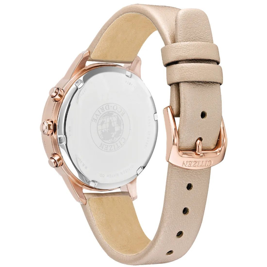 Este reloj CITIZEN Chandler es la pieza perfecta para el d¡a a d¡a por sus cl sicas l¡neas y sutil dise¤o femenino. Con una caja de acero inoxidable en tono oro rosa y car tula blanca que se complementa con la correa de piel vegana rosada. Cuenta con un cron¢grafo que mide hasta 60 minutos en unidades de 1/5 segundos y fechador.