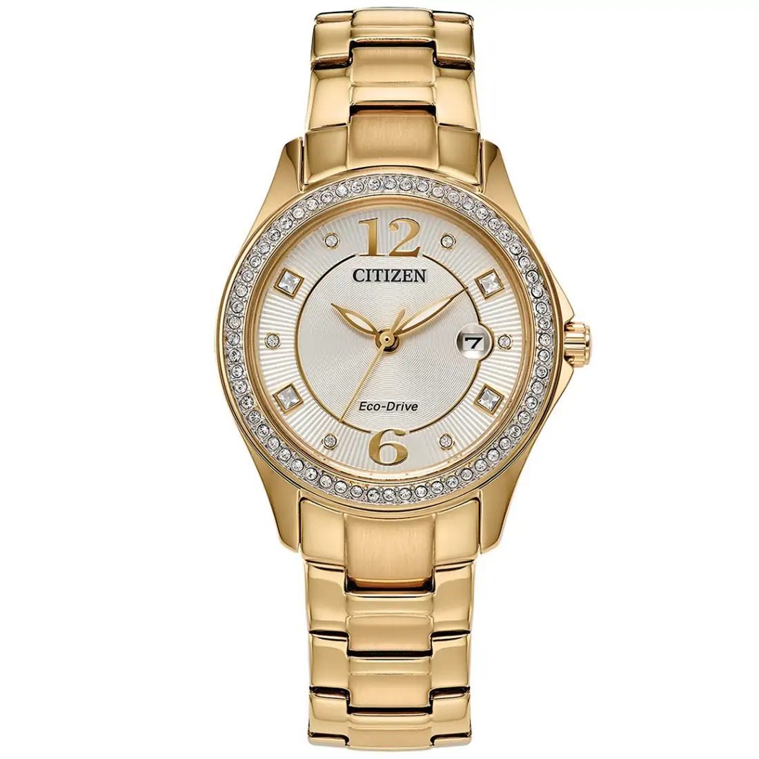 El Reloj Citizen Crystal FE1147-79P es una resplandeciente incorporaci¢n a la colecci¢n Crystal. Este elegante reloj brilla con 60 cristales en el bisel que rodean a la caja de acero inoxidable dorada. Su car tula en tono champa¤a cuenta con 10 cristales en los indicadores_ 3 manecillas y fechador.