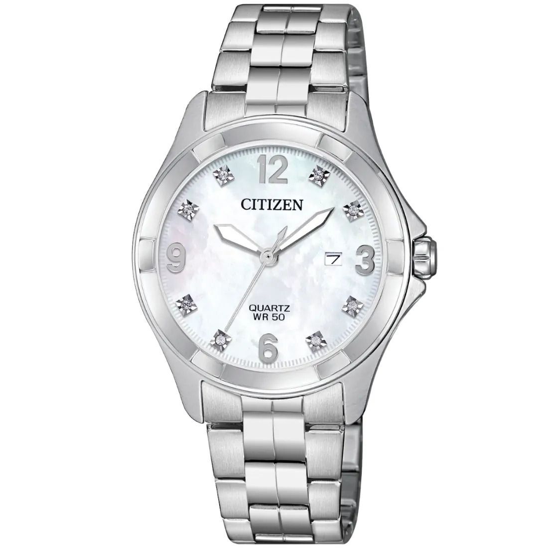 Elegante reloj de cuarzo para dama con caja y brazalete en acero inoxidable .Su car tula en madre perla blanca luce detalles de cristales. Es una atractiva pieza que completar cualquier estilo_ lo que lo convierte en el reloj favorito de cualquier colecci¢n.