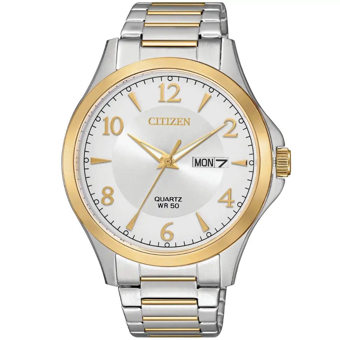 Reloj Citizen Cuarzo BF2005-54Aÿpara caballero con movimiento de cuarzo. Luce una caja de acero inoxidable y brazalete bitono. Su car tula plateada cuenta con d¡a y fecha.