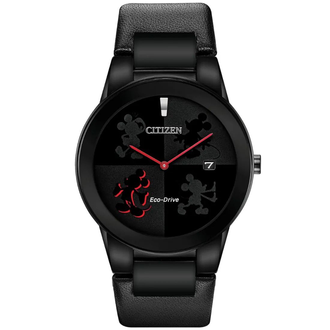 La colecci¢n de relojes para caballero de Mickey Mouse por CITIZEN© te mantendr siempre a tiempo con una moderna y atemporal silueta. Cuenta con una caja de acero inoxidable IP negro y correa de piel negra_ a juego con la car tula_ la cual luce la silueta de Mickey Mouse con detalles en rojo. Gracias a la tecnolog¡a Eco-Drive_ jam s requerir s cambiar la bater¡a.