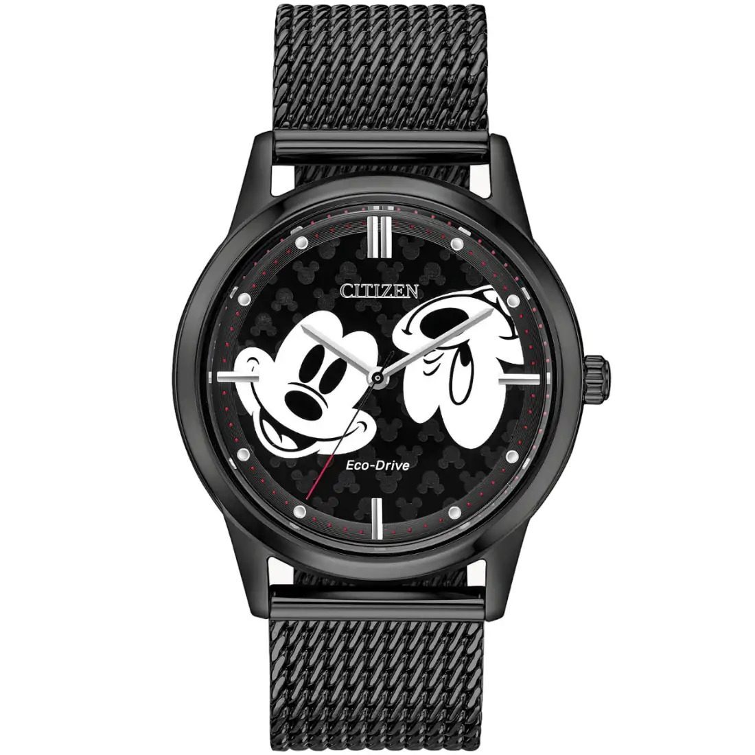 Diversi¢n_ amor y optimismo_ atributos memorables de Mickey Mouse_ ahora en este reloj de Mickey Mouse por CITIZEN©. Luce una caja de acero inoxidable negra con brazalete mesh a juego_ y una car tula grabada con la amigable cada de Mickey. Gracias a la tecnolog¡a Eco-Drive jam s requerir s cambiar la bater¡a.