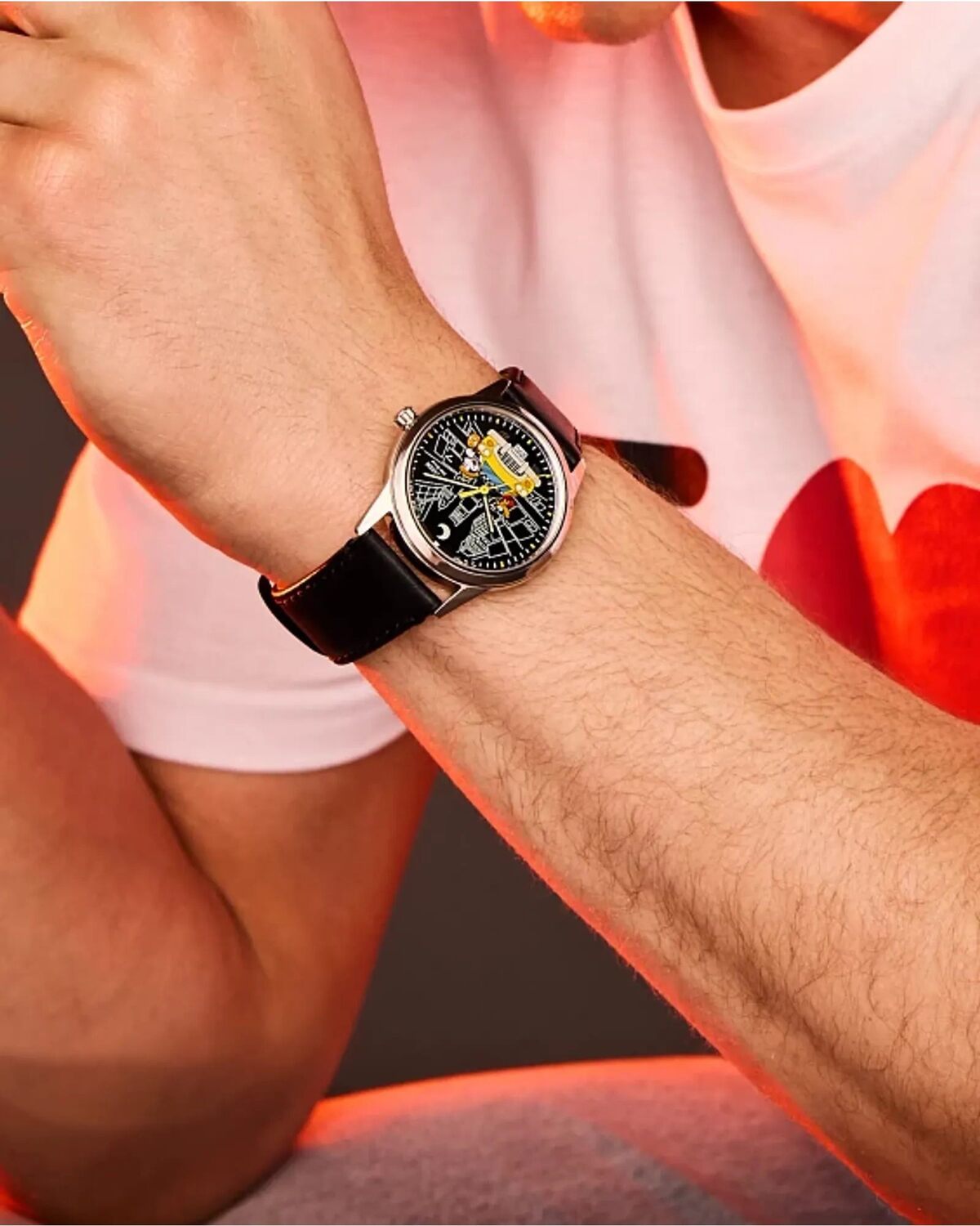 La tercera pieza de una colección de cuatro relojes inspirados en viajes nos lleva a la Gran Manzana_ donde Mickey Mouse de Disney y su fiel amigo Pluto exploran con entusiasmo la ciudad de Nueva York desde el asiento trasero de un clásico taxi Checker. La caja de acero inoxidable en tono plateado de 40 mm enmarca una car tula negra con una ilustración original de los artistas de Disney John y Shelly Loter_ que muestra a los dos amigos en un paisaje urbano nocturno lleno de rascacielos. En la car tula se iluminan las manecillas_ la luna_ los faros y la matricula del taxi.