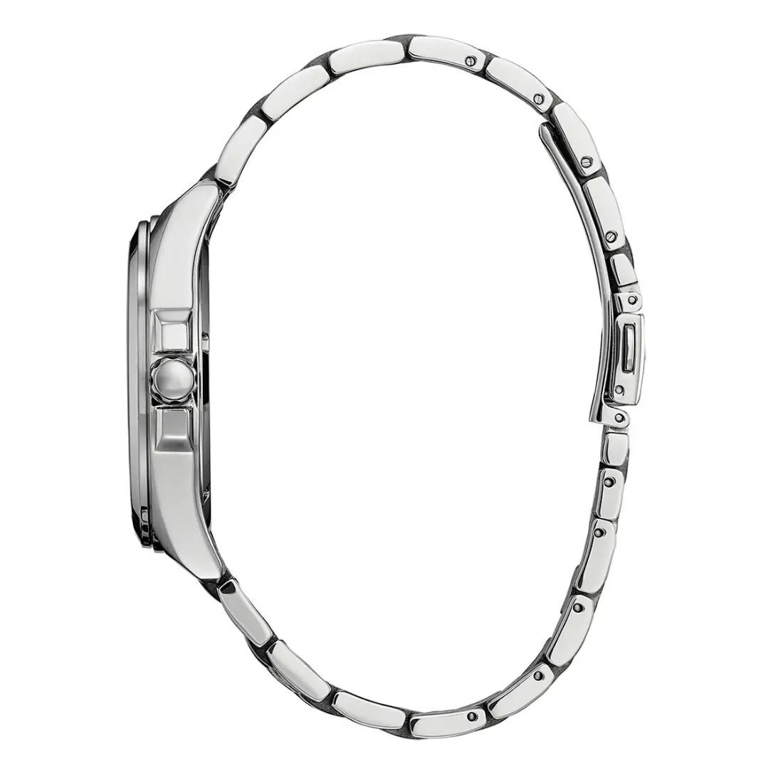Este reloj es una caracter¡stica declaraci¢n de estilo. Incluye una caja de acero inoxidable plateada y una car tula verde con 3 manecillas eÿindicadores luminosos y fechador_ cubierta por un cristal de zafiro. Este reloj es una combinaci¢n de lo sencillo con lo funcional y un toque de elegancia. El brazalete de acero inoxidable plateado cuenta con un broche desplegable con botones que le otorga una sutil sofisticaci¢n. Es resistente al agua hasta 100 metros.