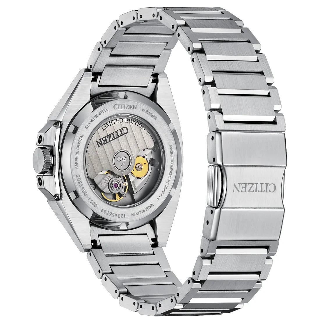 El nuevo Series8 831_ que representa la encarnaci¢n de un dise¤o cuidado y una ejecuci¢n ultralimpia_ presenta una caja facetada de acero inoxidable en tono plateado de 40 mm junto con las mejores t‚cnicas de acabado cepillado y pulido de Citizen. Resistente al agua hasta 100 metros y capaz de soportar campos magn‚ticos de hasta 16.000 A/m_ el reloj funciona con el calibre 9051 de alto rendimiento.
