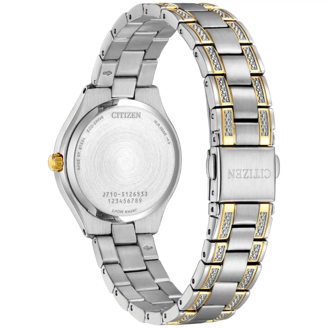 Cuando se trata de lo £ltimo en relojes para mujer_ la colecci¢n Silhouette Crystal de CITIZEN se lleva el primer premio. La caja y el brazalete de acero inoxidable bitono se combinan con un car tula de color azul marino con fechador. Cuenta con un total de 114 cristales incrustados en la caja y el brazalete que lo convierten en un reloj femenino y actual que se ver genial con cualquier estilo y en cualquier ocasi¢n.