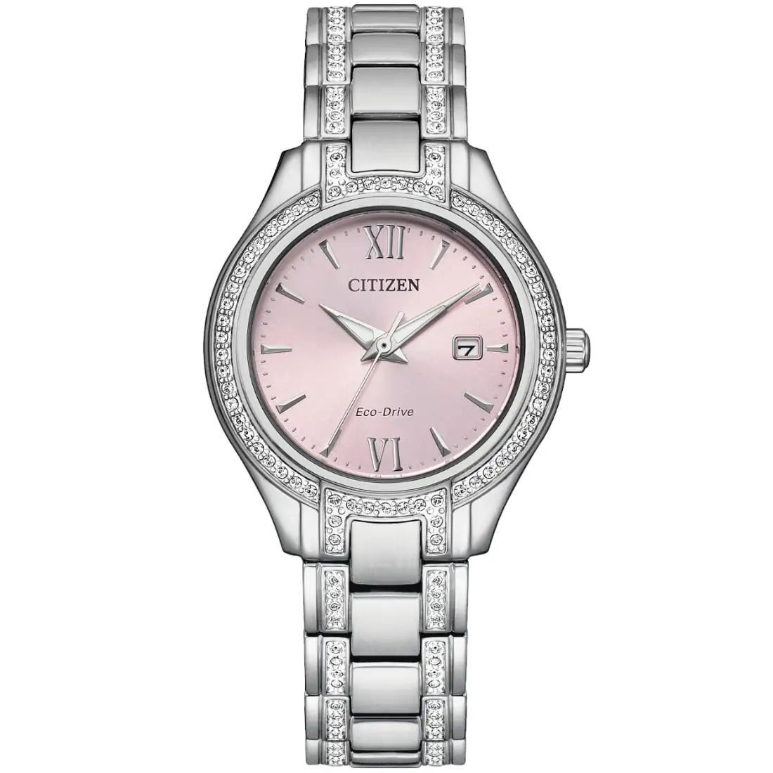 Cuando se trata de lo £ltimo en relojes para mujer_ la colecci¢n Silhouette Crystal de CITIZEN© se lleva el primer premio. La caja y el brazalete de acero inoxidable se combinan con un car tula de color rosa claro con fechador. Cuenta con un total de 114 cristales genuinos incrustados en la caja y el brazalete que lo convierten en un reloj femenino y actual que se ver  genial con cualquier estilo y en cualquier ocasi¢n.