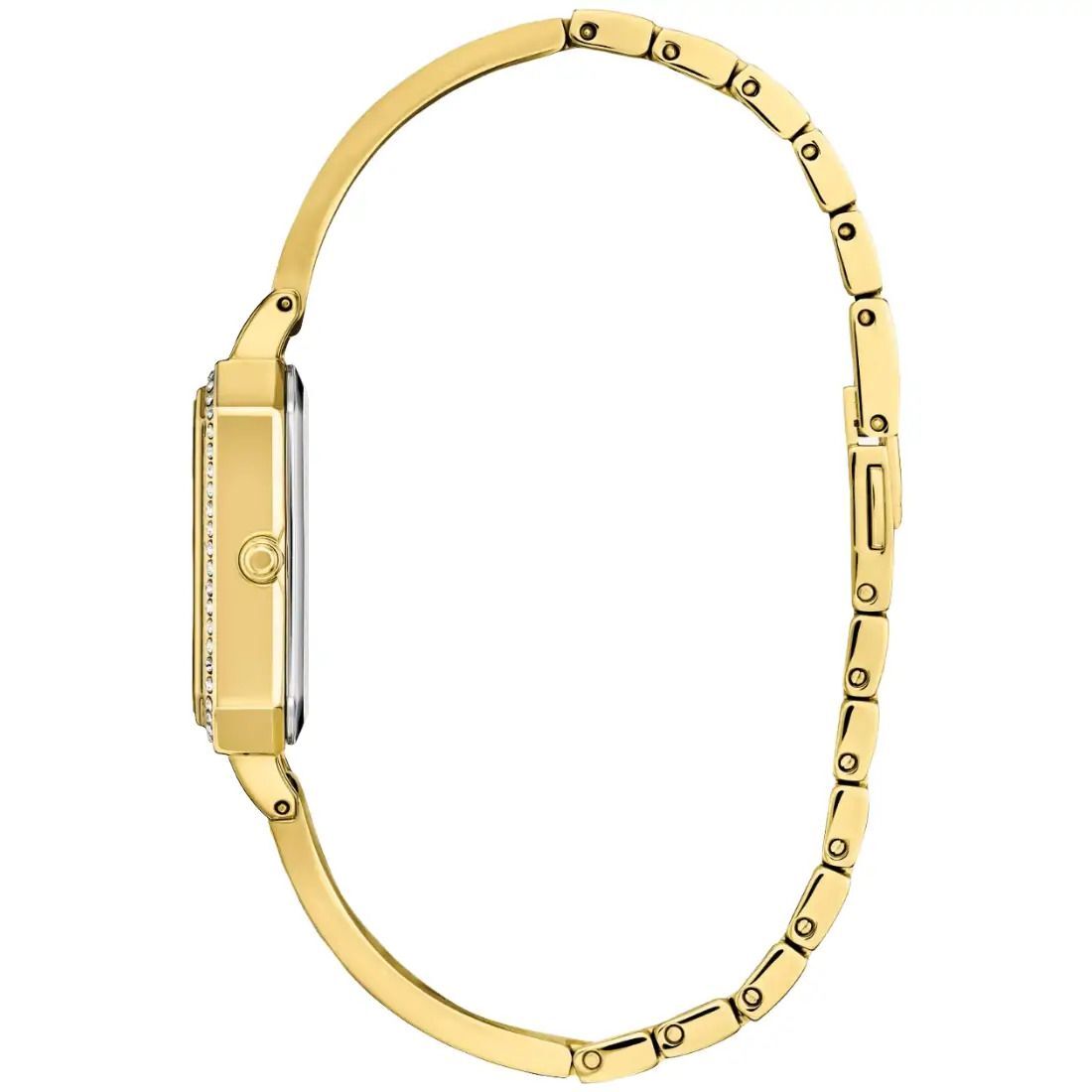 Eleve su apariencia con el reloj para mujer Citizen Silhouette Crystal que presenta una apariencia llamativa y elegante. La delgada pulsera en tono dorado est rodeada por un bisel brillante con detalles de cristal y una esfera negra que irradia lujo audaz. Este reloj para mujer de tres manecillas tiene un cierre de joyer¡a con pulsador y utiliza la tecnolog¡a sostenible Eco-Drive de Citizen para funcionar con luz. Este elegante reloj pasa maravillosamente de un d¡a en la oficina a una noche en la ciudad y agregar un toque de sofisticaci¢n a su apariencia general.