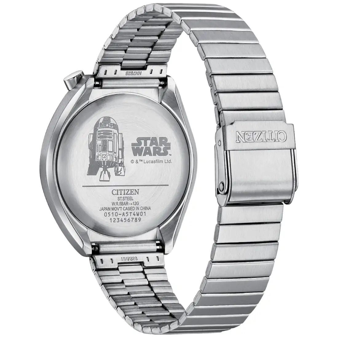 El conjunto de funciones del reloj inspirado en R2-D2 de la colecci¢n Star Wars™ | CITIZEN©? te har  tan ingenioso como el mism¡simo droide astromec nico. La caja de acero inoxidable en tono plateado refleja el dise¤o de R2-D2_ al igual que la car tula_ que tiene un aspecto en relieve que recuerda a sus paneles y est  acentuada con los distintivos detalles azules y rojos de R2-D2. La subcar tula en la posici¢n de las 6 tambi‚n tiene un detalle de R2-D2 en miniatura_ y el reloj cuenta con cron¢grafo_ fechador y brazalete de acero inoxidable plateado. El logotipo cl sico de Star Wars est  grabado en el reverso de la caja_ junto con una intrincada imagen del obediente droide.
