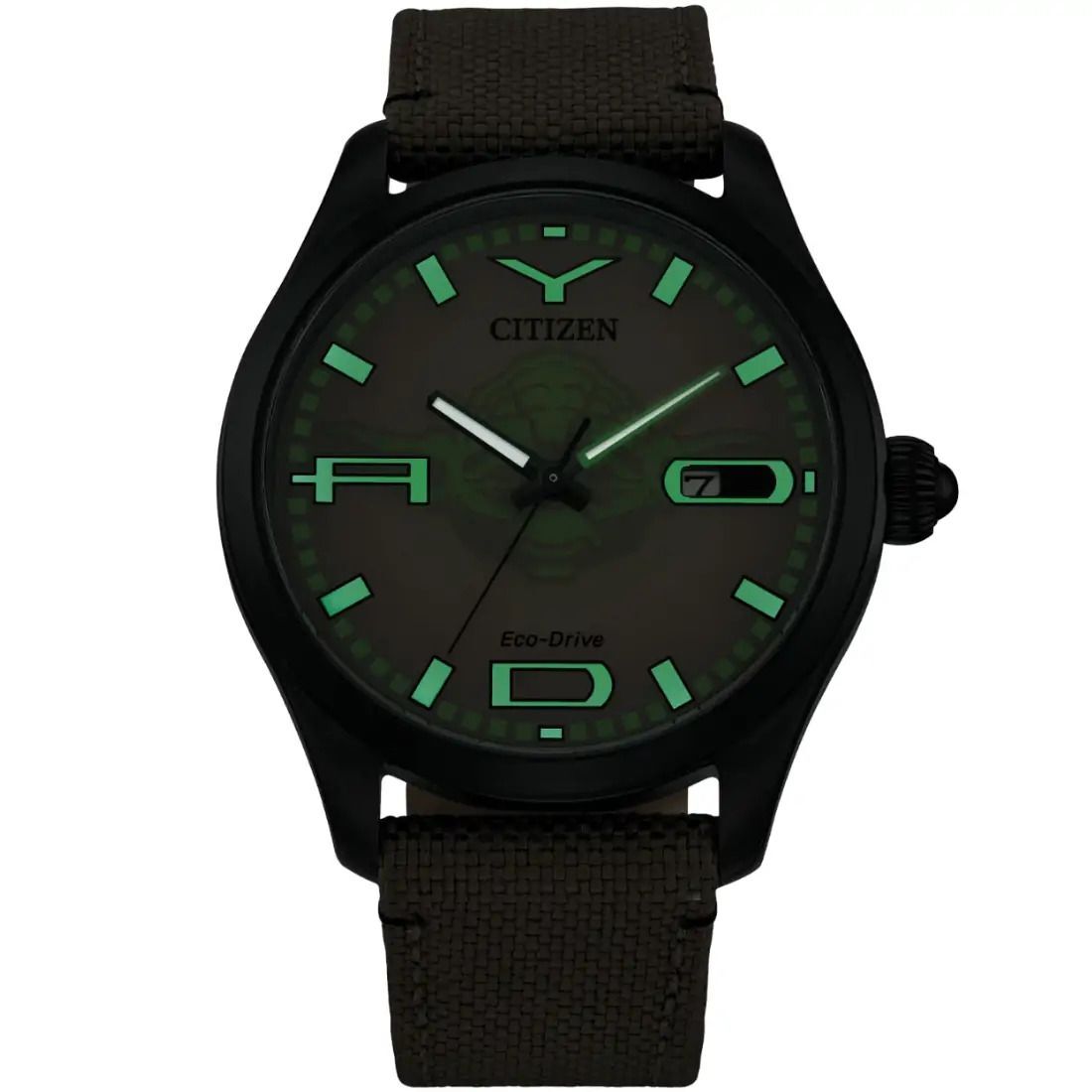 Ponte gal ctico con el poder y la precisi¢n del reloj CITIZEN© con tem tica de Yoda. Parte de la colecci¢n de Star Wars por CITIZEN©. Este sorprendente reloj cuenta con una audaz caja de acero inoxidable IP negro_ una correa de nylon Cordura© tan resistente como el propio Yoda y una sutil car tula color arena con fechador y manecillas e indicadores luminosos que deletrean Y-o-d-a. La tapa posterior est grabada con la imagen de Yoda y su cita cl sica: "Judge me by my size_ do you?".
